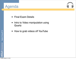 The document discusses details for the final exam for a class on digital DJing, including that it will take place on March 28th and students should prepare 20 minute sets practicing mixing and transitions. It also provides grading criteria focusing on technical skills, creativity, and engagement of the audience. Additionally, it introduces using the video manipulation software Quartz Composer to integrate video effects that can be controlled with a MIDI controller while DJing.