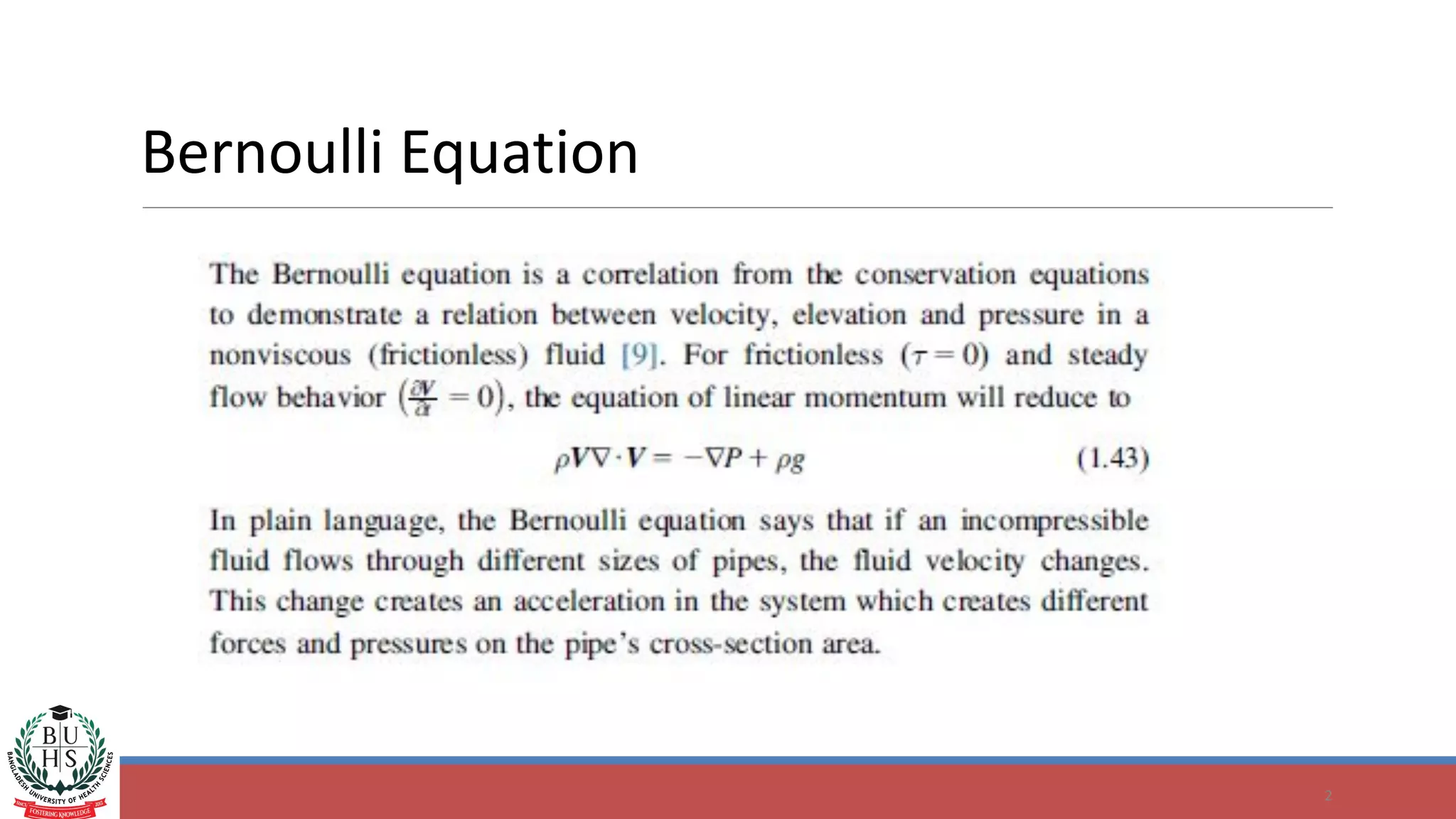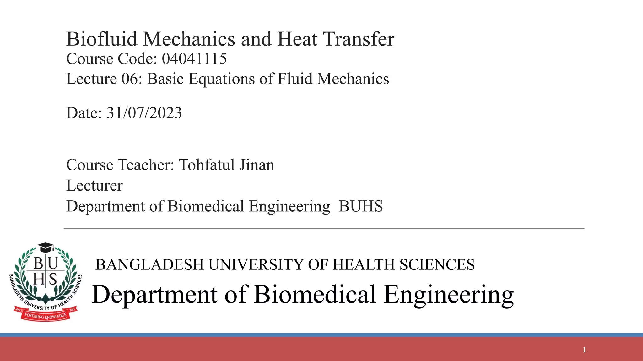 This document discusses basic equations of fluid mechanics used in a biofluid mechanics and heat transfer course. It covers the Bernoulli equation and its application to problems involving blood flow in the aorta and capillaries. It also discusses venturi meters, which use the Bernoulli principle to measure fluid flow rates. Venturi meters have a constricted section that causes velocity and pressure to change in a way that can be used to calculate flow rates. The document provides equations for calculating theoretical discharge through a venturi meter and defines related terms like cross-sectional area and velocity at different pipe sections.