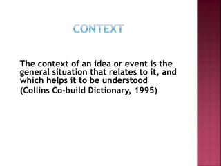 3. Several scholars, including Firth and Hymes, developed frameworks for systematically analyzing the elements of context, including participants, objects, settings, interactions, and how context influences meaning. Thoroughly understanding context is essential for discourse analysis
