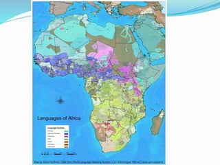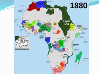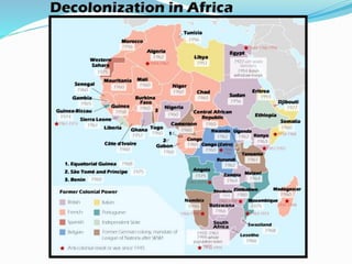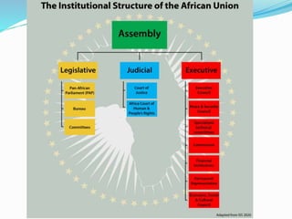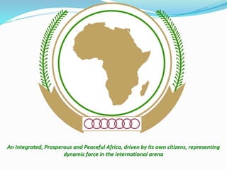 The document provides information about the history and establishment of the African Union (AU). It discusses how the AU replaced the Organization of African Unity (OAU) in 2002 in order to further economic development and international cooperation in Africa. Key events included the establishment of the OAU in 1963 and the adoption of the Constitutive Act in 2000, which legally transformed the OAU into the AU. The AU is based in Addis Ababa, Ethiopia and has 54 member states. Its objectives include promoting unity, sovereignty, and socioeconomic development across the continent.