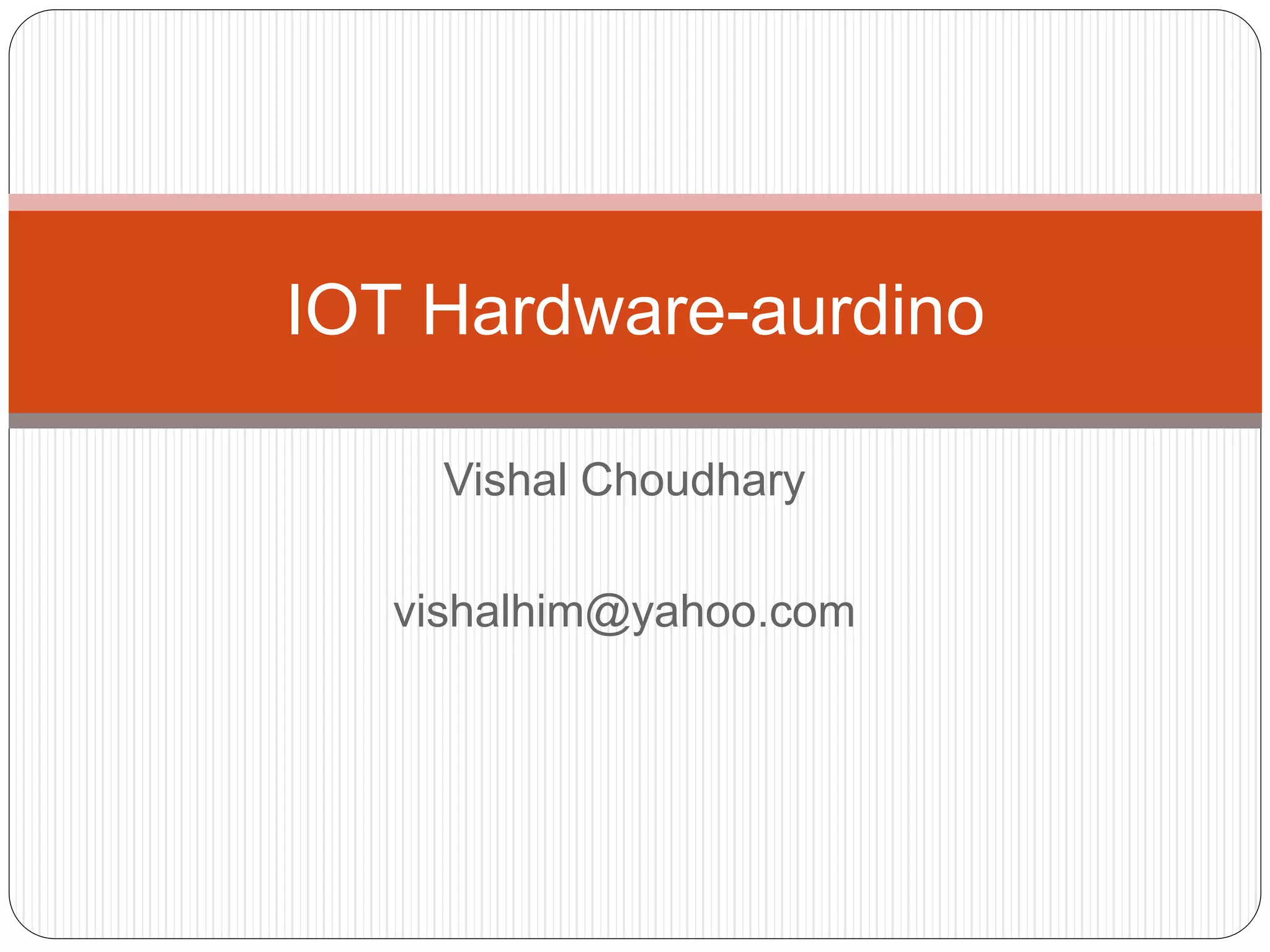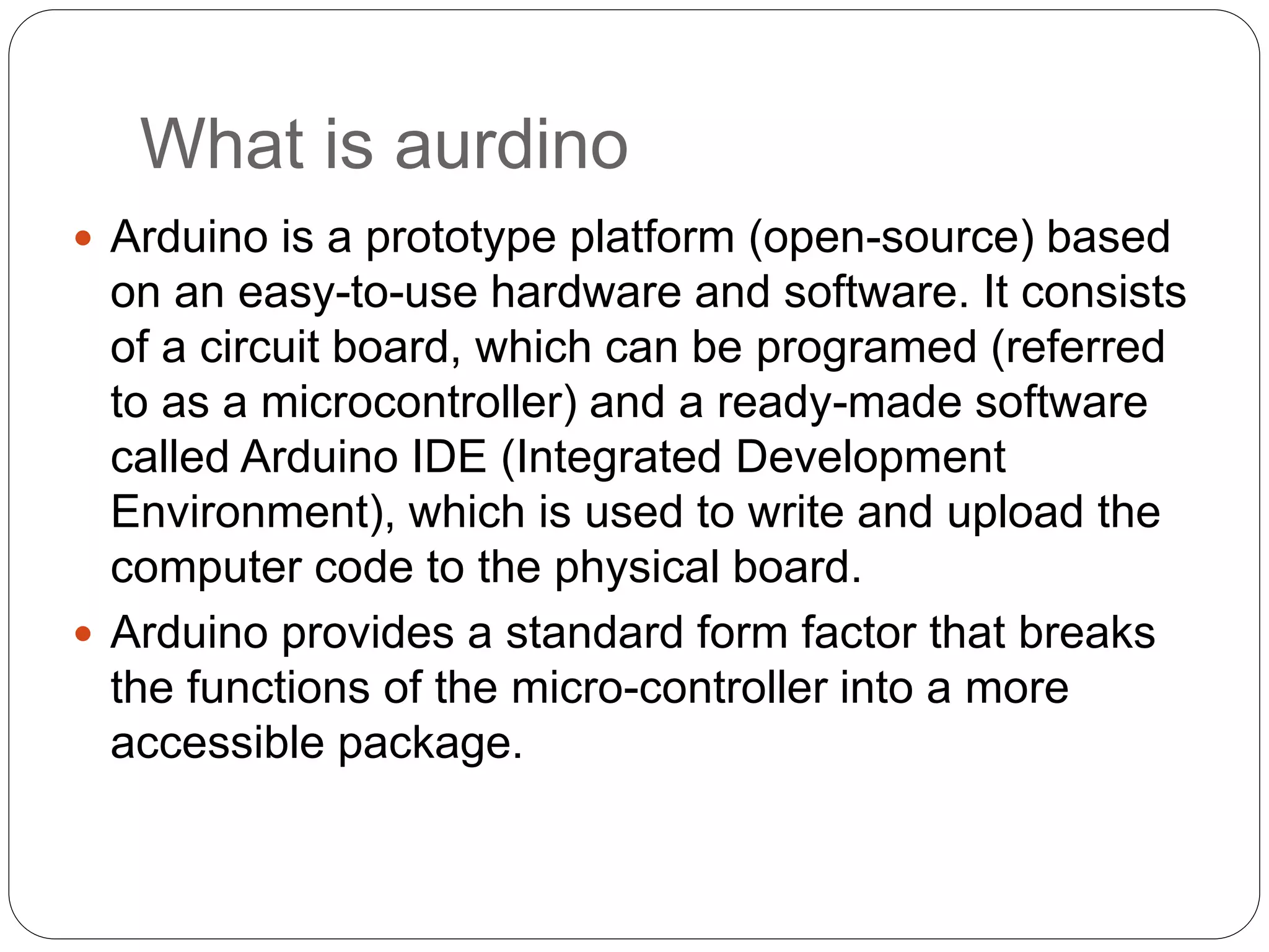 This document provides information about the Arduino hardware platform. It defines Arduino as an open-source hardware platform used for prototyping that consists of a programmable circuit board and IDE software. It then describes the key features of Arduino boards, including reading analog/digital sensor inputs and controlling outputs. The document proceeds to explain the components of a basic Arduino board and how to install and use the Arduino IDE software to write and upload programs.