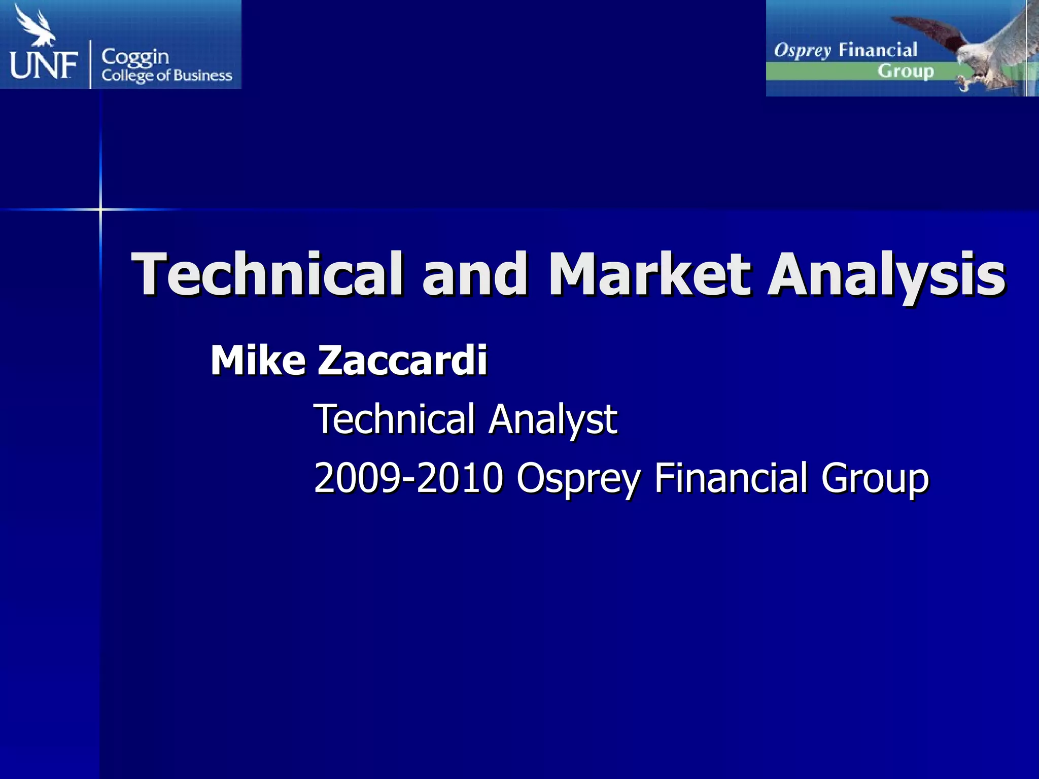 The document provides a summary of a technical and market analysis presentation by Mike Zaccardi. It defines technical analysis and its key assumptions. It outlines different categories of technical indicators like momentum, contrarian, and smart money indicators. It then analyzes current market conditions and provides charts and analysis of different indexes, commodities, sectors, and individual stocks. It concludes with a discussion of other technical analysis tools and resources for learning technical analysis.