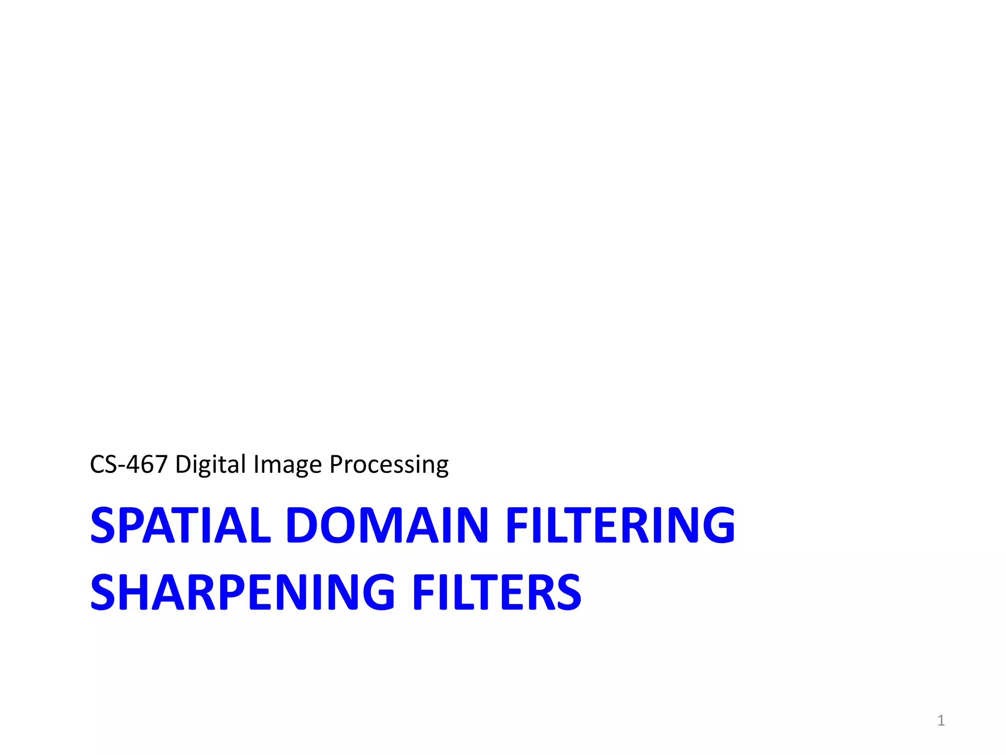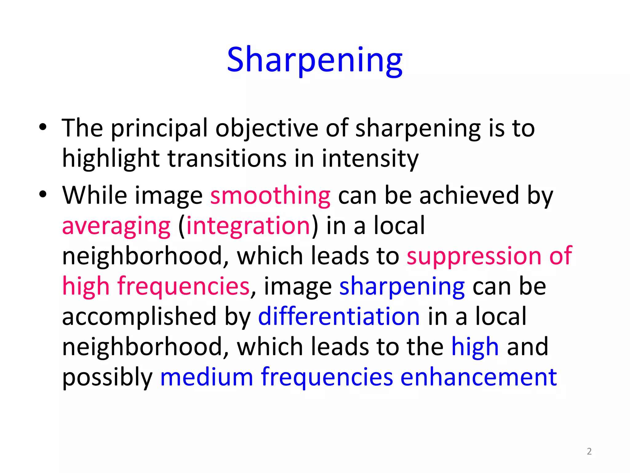 This document discusses sharpening filters used in digital image processing. It describes two types of sharpening filters: high-pass filters that enhance high frequencies and frequency correcting filters that enhance high and medium frequencies. Unsharp masking is presented as a classical frequency correcting filter that subtracts a blurred version of an image from the original to highlight transitions. Practical implementations of linear and nonlinear unsharp masking filters are shown for local and global frequency correction. Parameters for controlling the level of sharpening and frequency enhancement are also discussed.