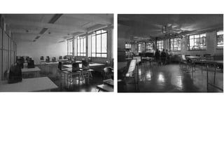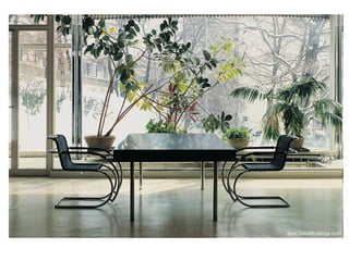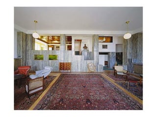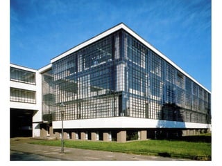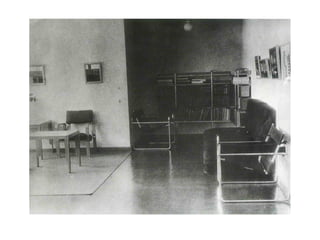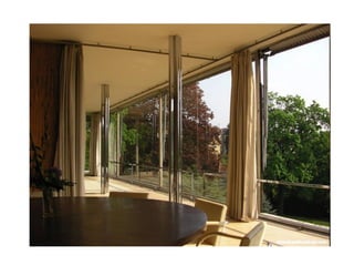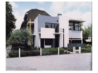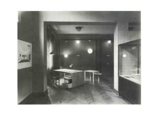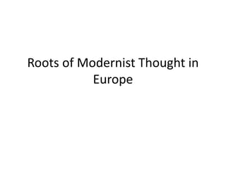 This document provides an overview of the roots of modernist thought and architecture in Europe from 1910 to 1930. It showcases key figures like Adolf Loos, Peter Behrens, Walter Gropius, Mies van der Rohe, and Gerrit Rietveld. It features their pioneering modernist buildings like the Steiner House, AEG Turbine Factory, Bauhaus school, German Pavilion, Villa Tugendhat, and Schröder House. It also highlights the developments in art, furniture, and design coming out of movements like De Stijl during this transformative period for modern architecture and design.