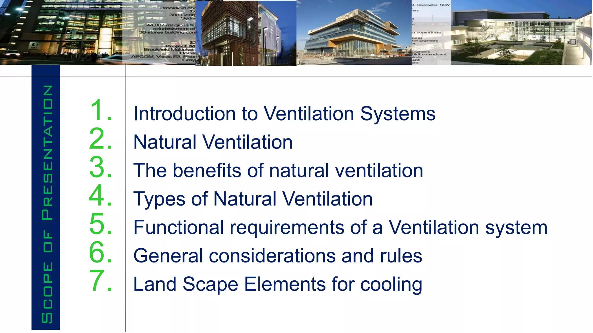 This document discusses passive ventilation systems. It begins with an introduction to ventilation systems and the types of ventilation - natural and mechanical. The benefits of natural ventilation are then outlined, including improved air quality, energy savings, and more. The document describes the two main types of natural ventilation - wind effect and stack effect. Wind effect ventilation uses wind direction and pressure differences to move air through cross or single opening ventilation. Stack effect relies on warm air rising to ventilate spaces. Examples of passive ventilation technologies like wind catchers are provided. Design considerations for natural ventilation systems include location and size of inlets and outlets. Landscaping elements that can help with passive cooling like trees and shading are also discussed. The presentation concludes with an overview