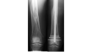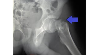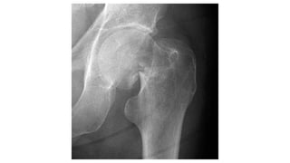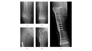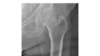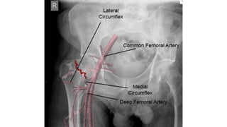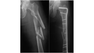 This document discusses femoral fractures, categorized by their location and severity, with classifications such as Garden classification. It outlines the types of fractures, including valgus impacted, non-displaced, partially displaced, and fully displaced, along with their surgical treatment options. Additionally, it briefly describes distal femur fractures, which occur just above the knee joint.