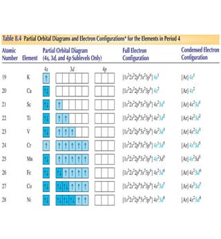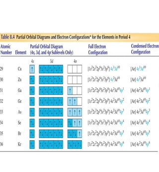 3) The document provides examples of writing out electron configurations for elements and explaining the rules for filling atomic orbitals in the Aufbau principle.