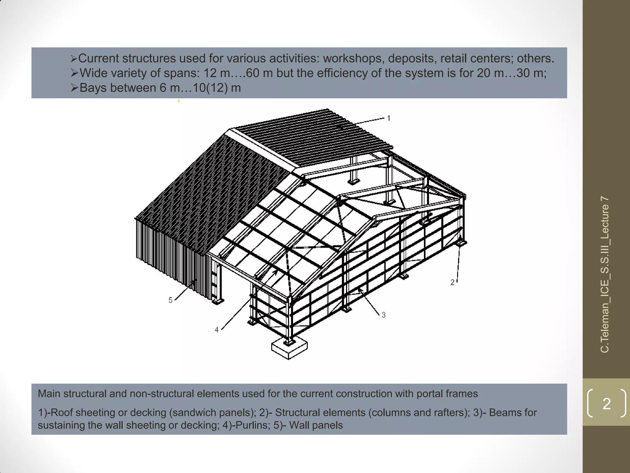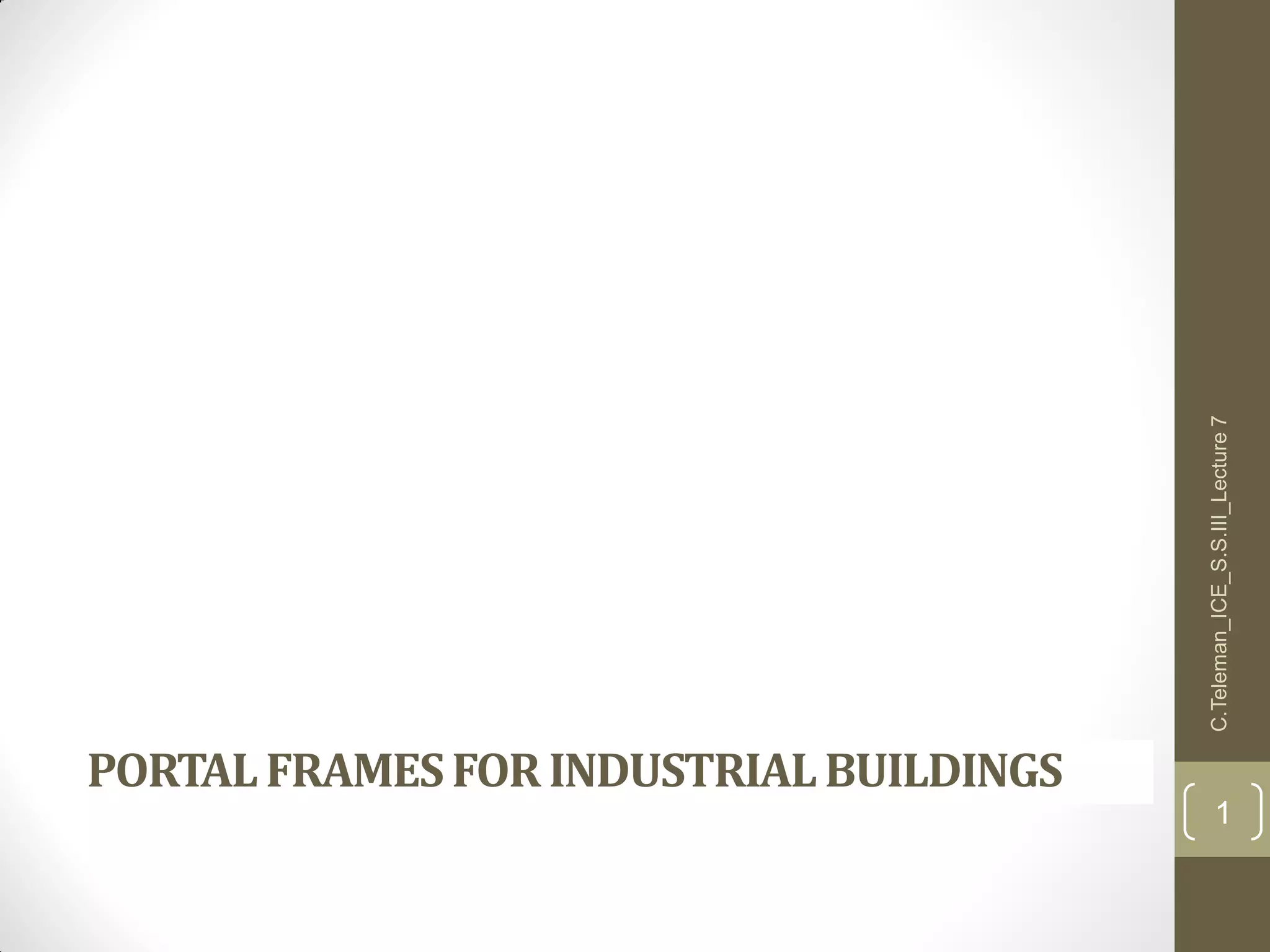 This document discusses portal frame structures used for industrial buildings. It describes the main structural elements including roof sheeting, columns, rafters, beams, and wall panels. Typical spans for portal frames range from 12 to 60 meters, though 20-30 meters is most efficient. Various structural systems and joint connections are examined, including different types of column-rafter joints, apex joints, and design considerations for analyzing and strengthening these critical connections to transfer forces between members. Equations are provided for analyzing stresses in the joints.