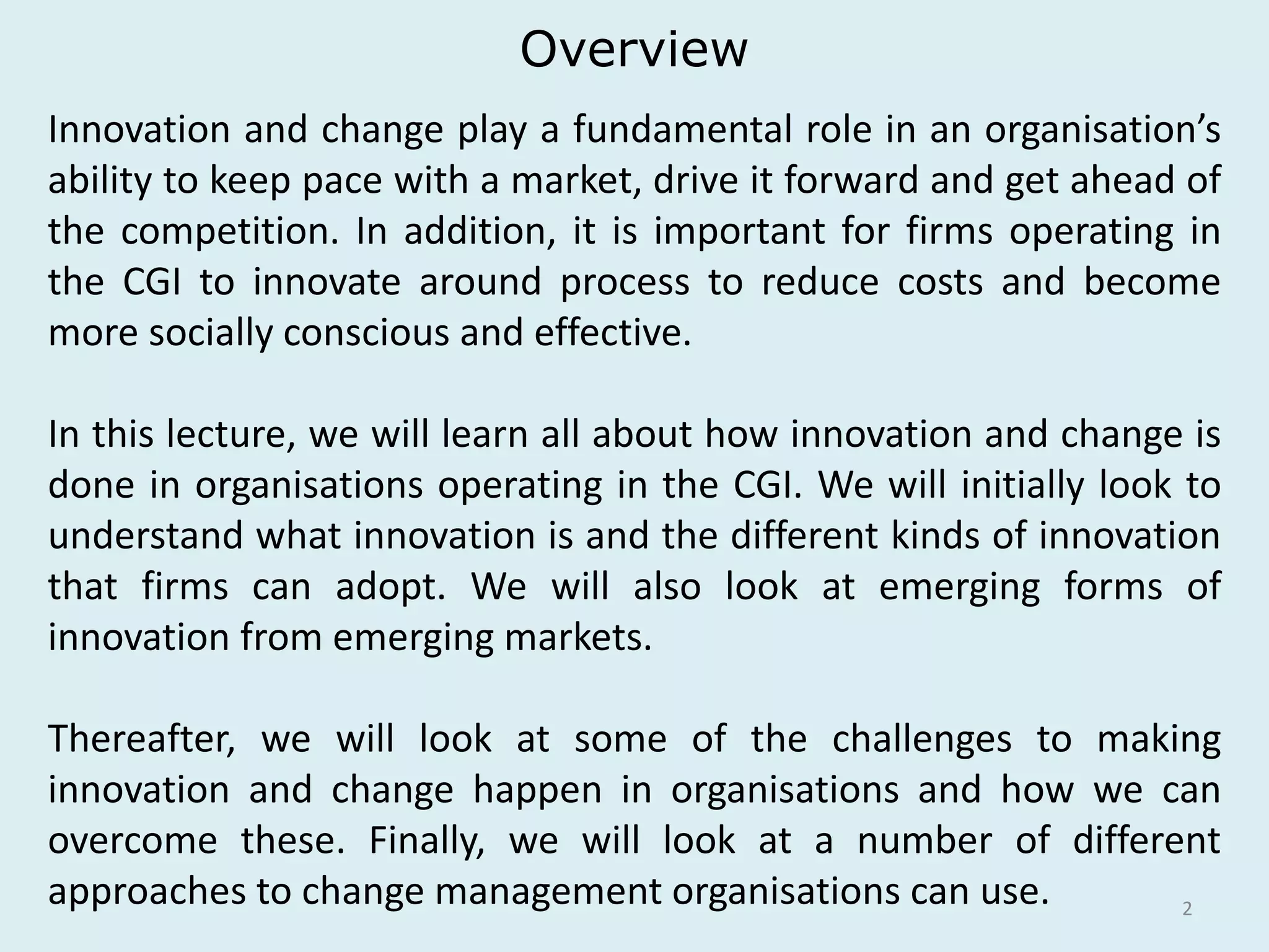 This document provides an overview of a lecture on innovation and change in the consumer goods industry. It begins by defining innovation and discussing the different types, including product and process innovation. It also covers challenges to innovation implementation and different approaches to managing organizational change. The learning outcomes are to understand models of innovation, challenges to innovation, and how to evaluate change models. The document then explores topics like disruptive innovation, innovation in Western firms versus emerging markets, and dealing with innovation failures.