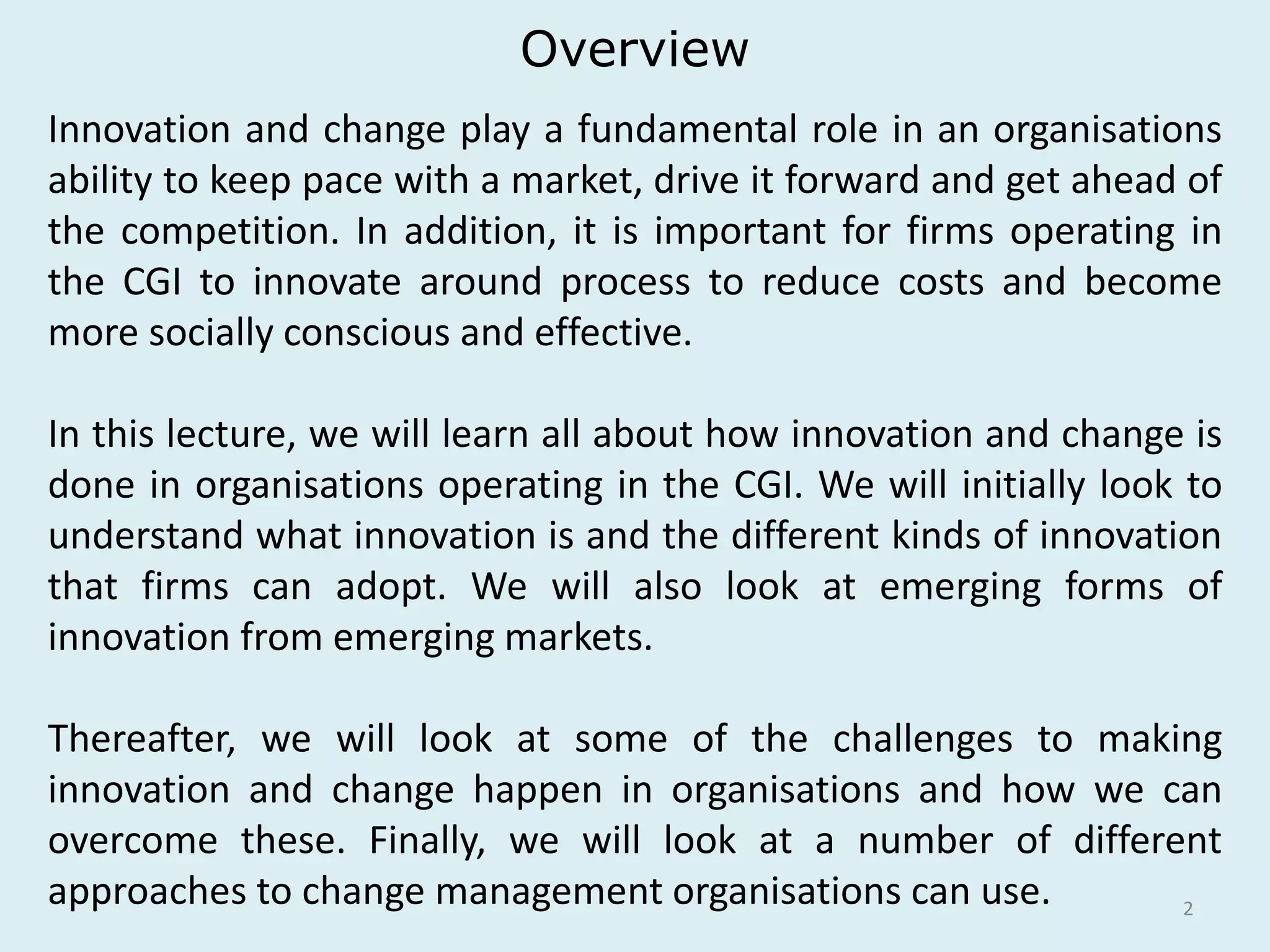 This document provides an overview of a lecture on innovation and change in the consumer goods industry. It will examine what innovation is, different types of innovation, challenges to innovation, and approaches to managing change. The learning outcomes are to understand models of innovation, discuss challenges and evaluate models for creating organizational change. The lecture will look at innovation in firms, disruptive innovation, and examples of innovation approaches used in Western firms compared to emerging markets.