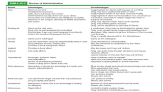 This document discusses various topics related to medication administration including definitions of key terms, controlled substances procedures, effects of drugs, factors affecting drug action, types of medication orders, parts of prescriptions, systems of measurement, drug calculations, medication dispensing systems, the process of administering medications, the ten rights of administration, physiological changes associated with aging, administering medications safely, and causes of medication administration errors.