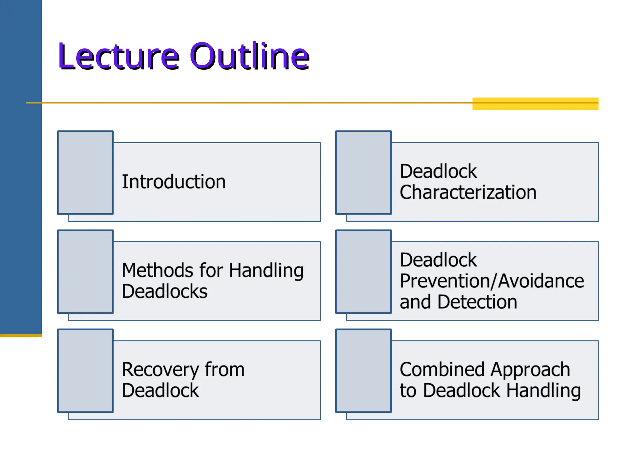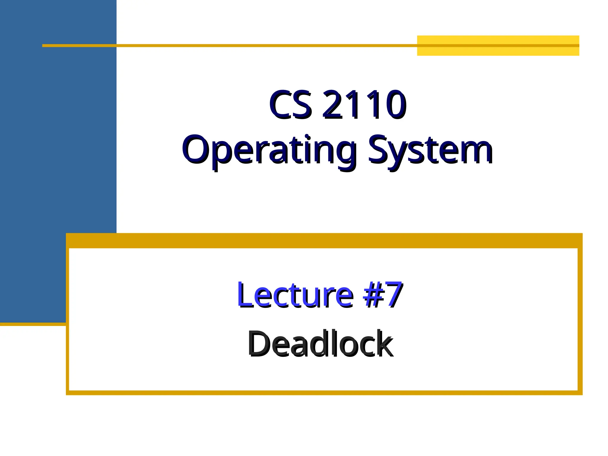 The document discusses deadlock in operating systems, defining it as a situation where blocked processes are holding resources while waiting for others, outlining four necessary conditions for its occurrence: mutual exclusion, hold and wait, no preemption, and circular wait. It also covers methods for handling deadlocks, including prevention, avoidance, and detection, with detailed explanations of algorithms such as the Banker's algorithm and resource-allocation graphs. The document explains safe states, potential system issues following deadlock detection, and recovery strategies like process termination and resource preemption.