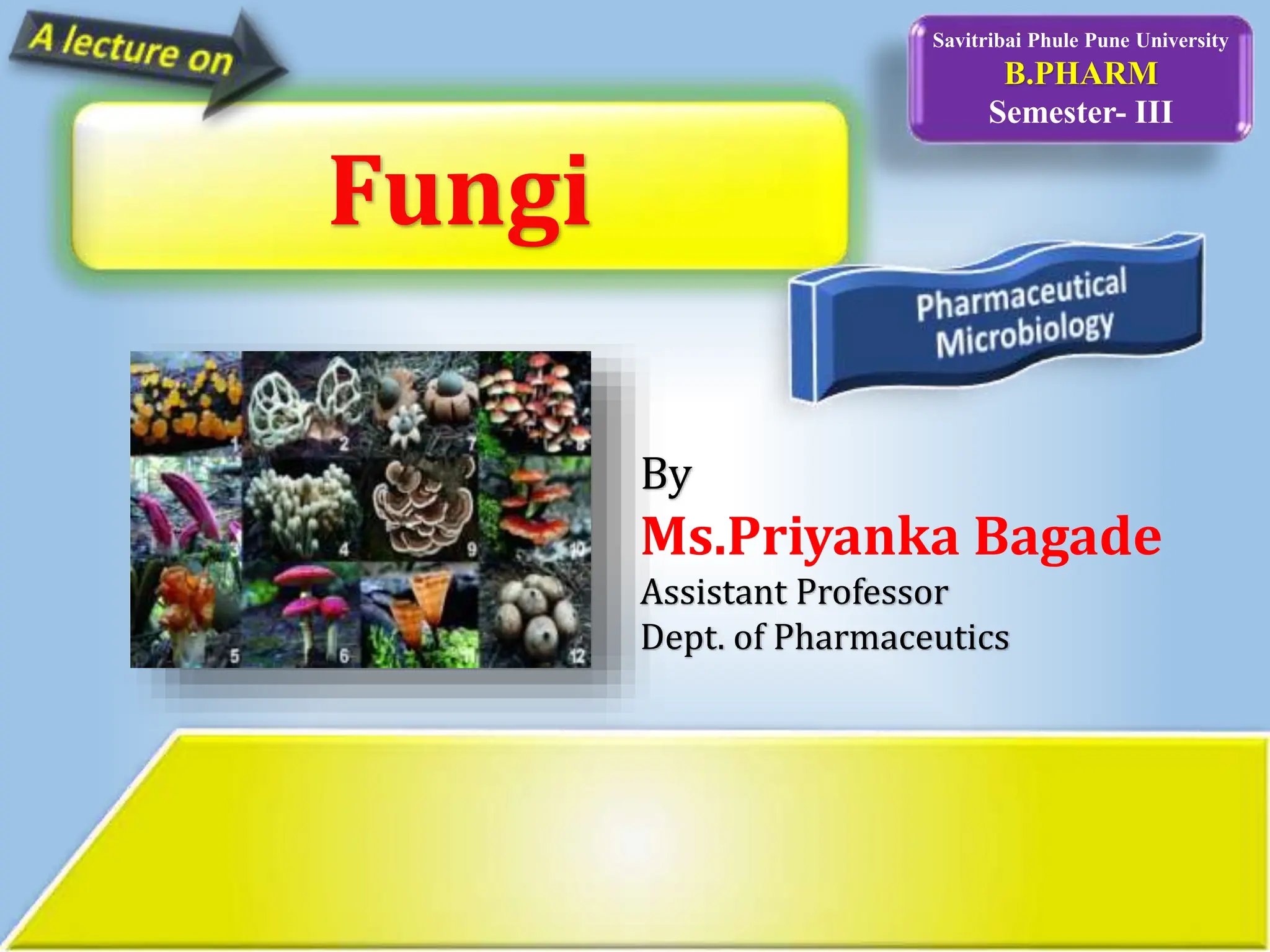 This document appears to be a presentation on fungi from Savitribai Phule Pune University for a third semester Bachelor of Pharmacy course. It was created by Ms. Priyanka Bagade, an assistant professor in the Department of Pharmaceutics. Over 40 numbered points are made about fungi in the presentation, which aims to educate pharmacy students on the topic. The presentation concludes by thanking the audience and noting it took place in Maharashtra, India.