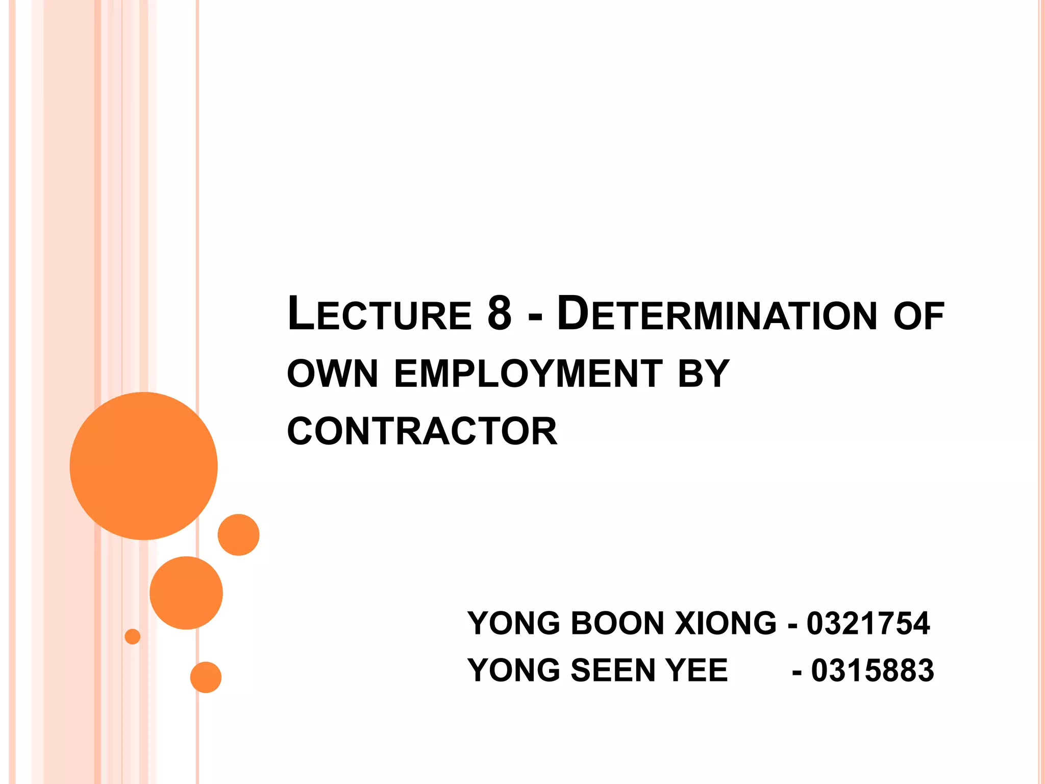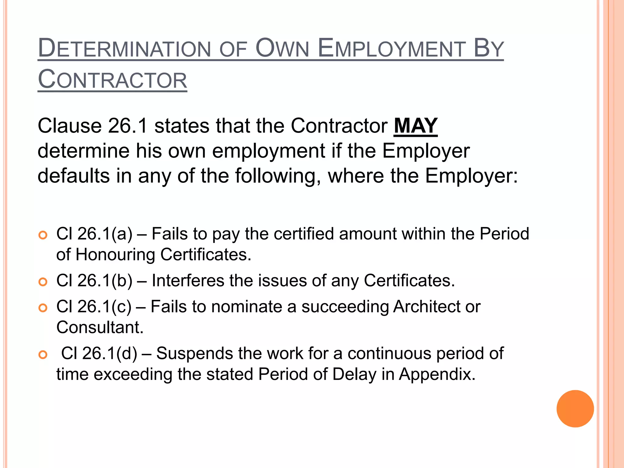 The document discusses the determination of a contractor's own employment under Clause 26 of the PAM 2006 contract. It outlines the different scenarios where a contractor may determine their own employment, including if the employer fails to pay certified amounts, interferes with certificates, fails to appoint a new consultant, or suspends works for an extended period. The procedure for determination involves issuing a notice of default, and if not rectified, a notice of determination within specified timeframes. The contractor must then vacate the site and submit a final account. The document also discusses rights and remedies after determination, as well as additional scenarios covered in tutorial questions.