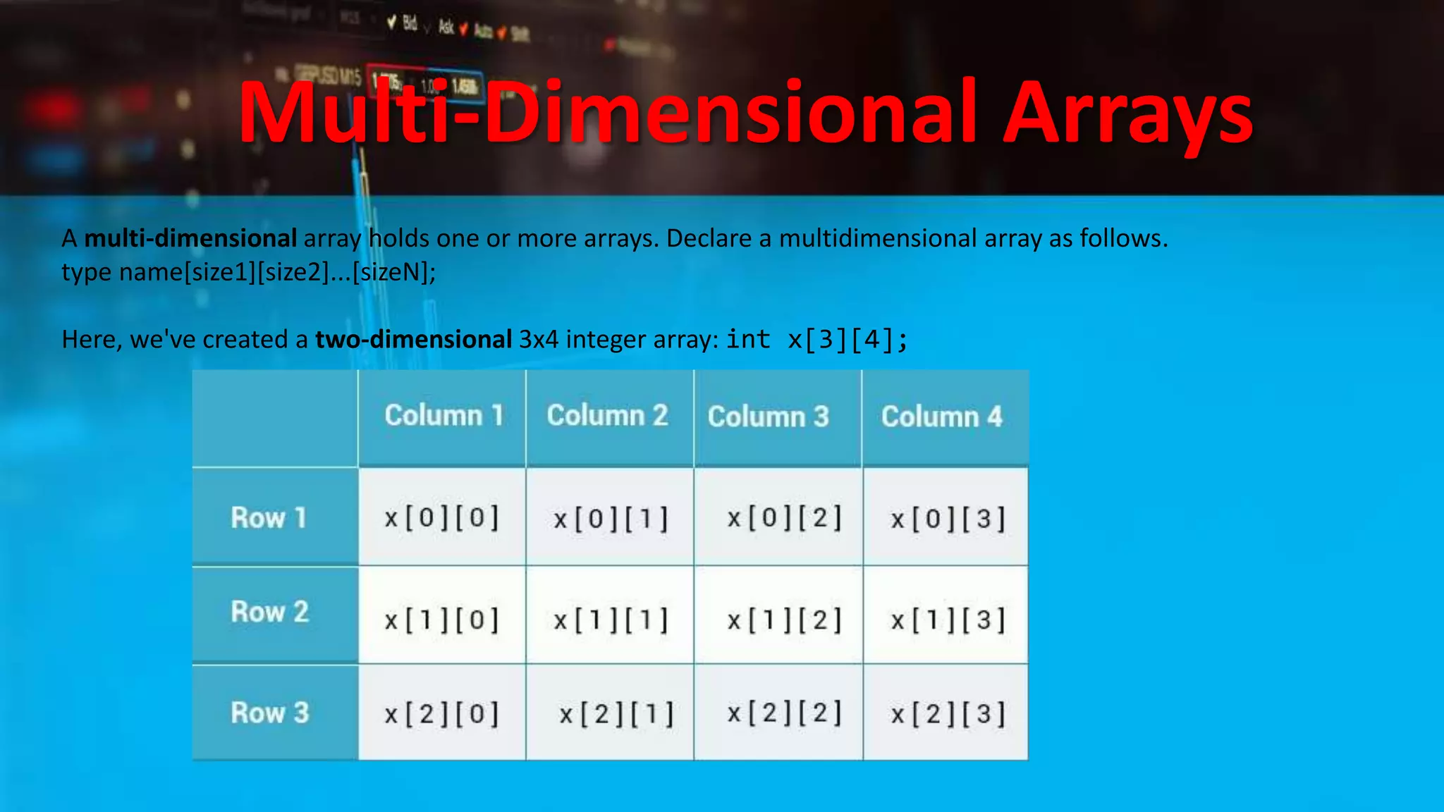 The document covers C++ programming concepts related to multi-dimensional arrays and pointers. It explains how to declare and initialize multi-dimensional arrays, access their elements, and provides insights into pointers, including their declaration, usage, and operations. Additionally, it touches on boolean variables, naming conventions for variables, and array manipulation techniques.