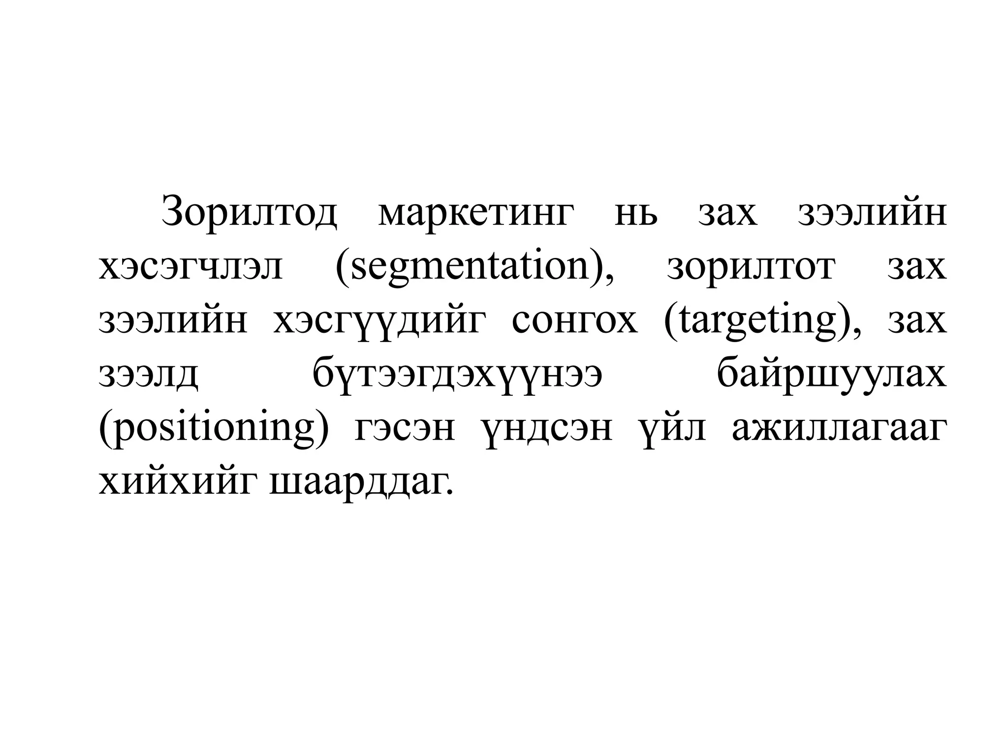 • Тогтоосон зах зээлийн хэсгүүдэд маркетингийн