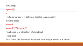 This document discusses importing data from CSV files into R and performing calculations and analysis on the data. It covers changing the working directory in R, importing CSV data and assigning column comments, and calculating summary statistics like the mean, median, and standard deviation of columns of data. It also demonstrates creating bar plots, pie charts, histograms and calculating the correlation between variables and fitting a linear regression model.