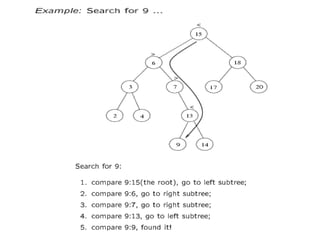 The document discusses binary search trees (BSTs). It defines a BST as a binary tree where the value of each node is greater than all values in its left subtree and less than all values in its right subtree. It provides examples of BSTs and non-BSTs. Searching, inserting, and deleting operations on a BST have O(log n) time complexity on a balanced tree but can be O(n) on a degenerate tree. Insertion and deletion can cause imbalance in the tree over time.