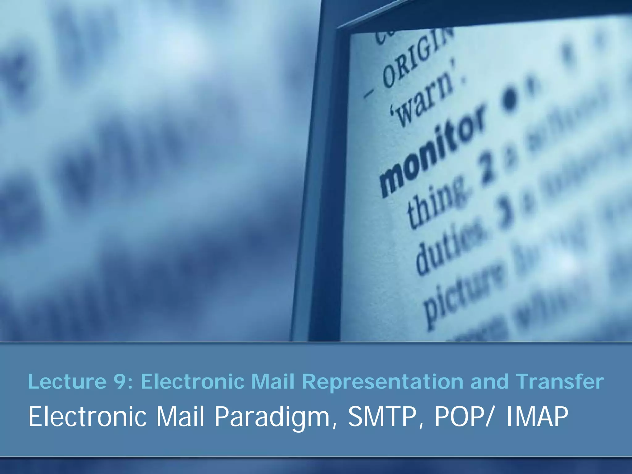 This document discusses electronic mail representation and transfer. It describes the user agent, which prepares messages and stores them in mailboxes. Message transfer agents like SMTP transfer messages between systems using commands and responses. POP3 and IMAP are message access agents that allow users to retrieve messages stored on mail servers through protocols like POP3 or IMAP. MIME extensions allow non-text content like images and files to be sent via email.