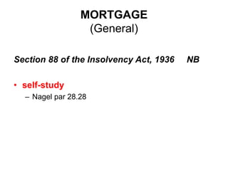 The document discusses various types of security interests in South African law including mortgages, cession in security, hypothecs, and liens. It provides details on: