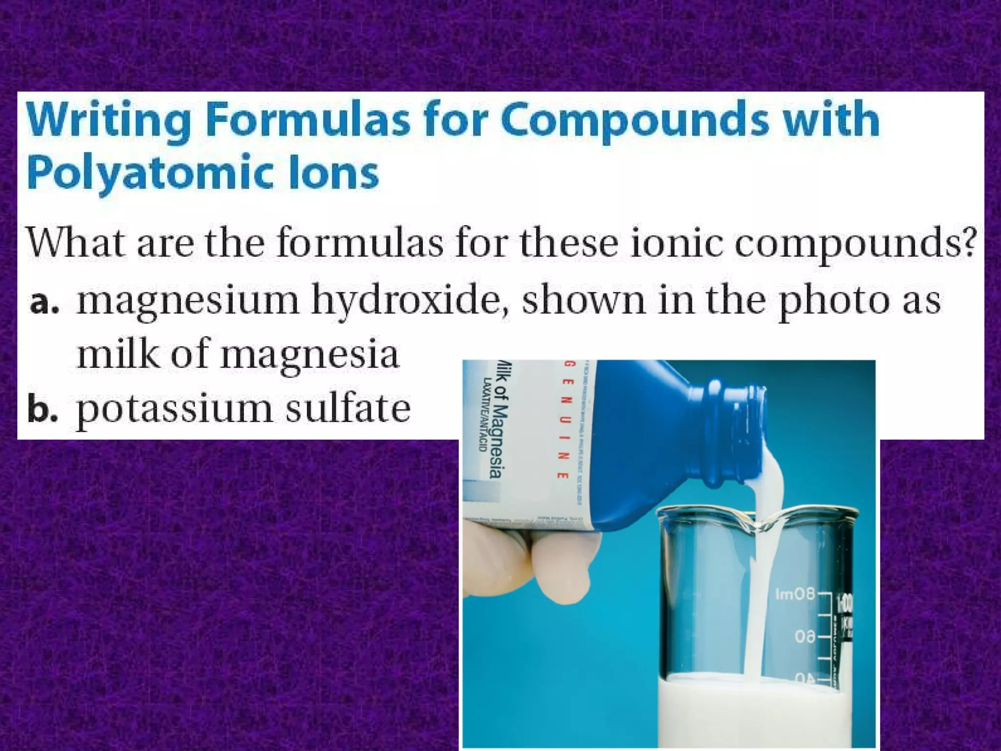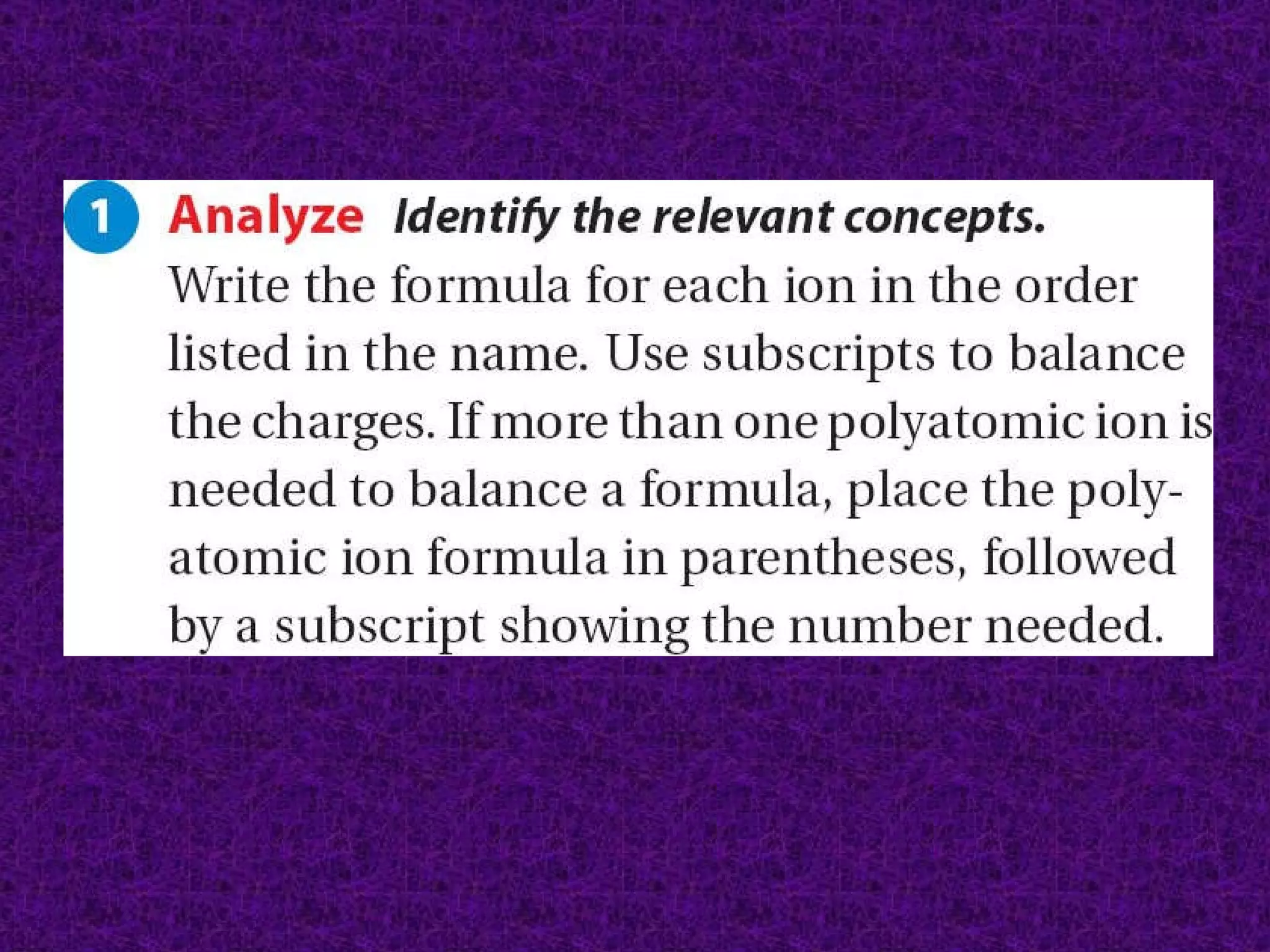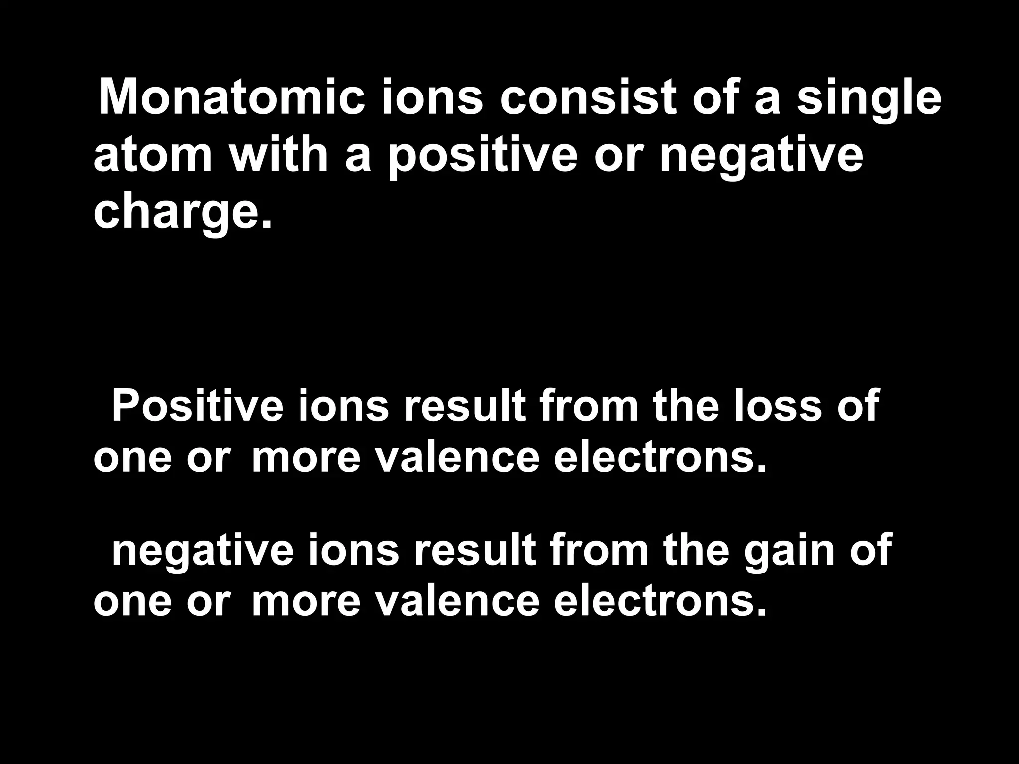 The document discusses chemical names and formulas of ions. It explains that monatomic cations form when metals lose electrons and gain a positive charge equal to their group number. Monatomic anions form when non-metals gain electrons and have a negative charge equal to the group number minus 8. Polyatomic ions consist of multiple atoms and have an overall positive or negative charge. Transition metals can form multiple ions with different charges that must be specified. Ionic compounds are named by writing the cation first followed by the anion.
