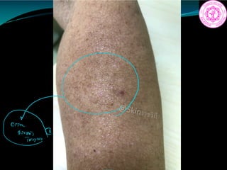 0.5 to 2 cm in diameter) with fine scaling, which are typically