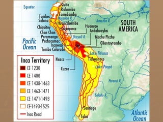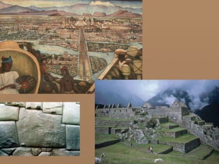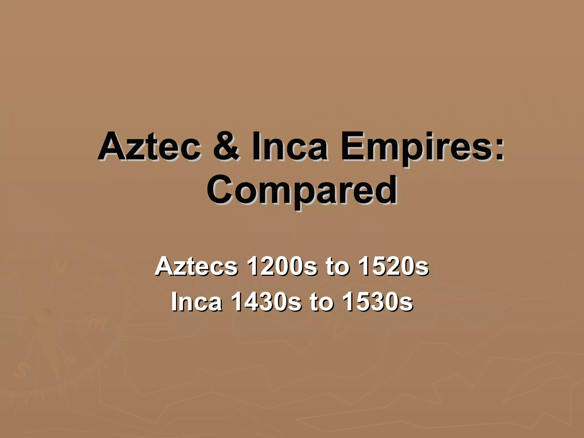 The Aztec and Inca Empires shared some similarities in their origins, economies, and methods of governance, but also had some key differences. Both empires arose from earlier civilizations and were based around managing resources and people through intensive agriculture. However, the Inca Empire more directly administered conquered territories through governors and infrastructure projects, while the Aztec Empire allowed more local autonomy as long as tribute was paid. Rulers in both empires had absolute divine power, but the Inca ruler's reign was tied to being the sun god's representative on earth.