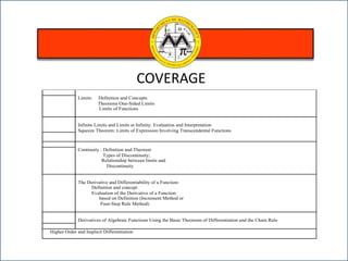 - Evaluating limits, determining continuity of functions, and taking derivatives of algebraic functions using basic theorems of differentiation.