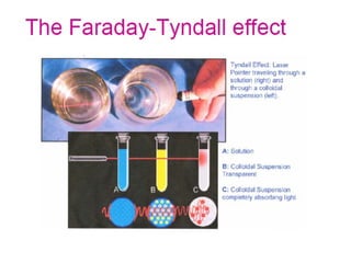 This document discusses colloids and their properties. It defines colloids as dispersed systems with particle diameters between 1 nm and 1000 nm. Colloids have large surface areas and can be classified as lyophilic, lyophobic, or association colloids. Common examples and methods of preparation are provided. The document also discusses optical properties like Tyndall effect and use of electron microscopes to view colloids, as well as comparisons between types of colloids.