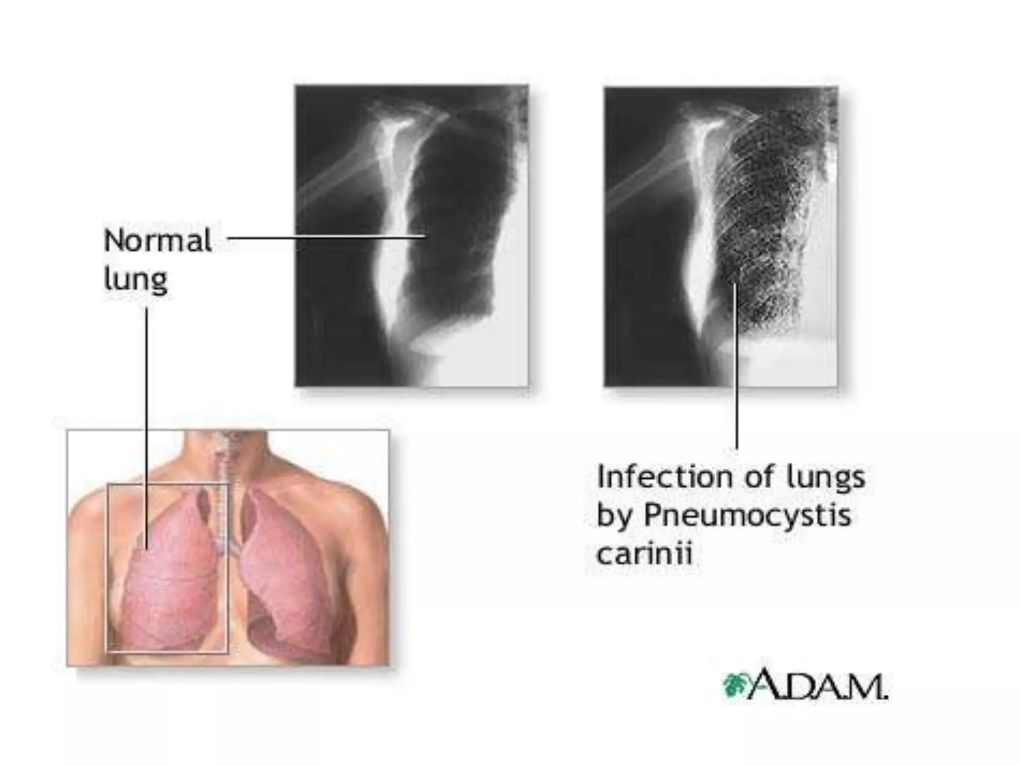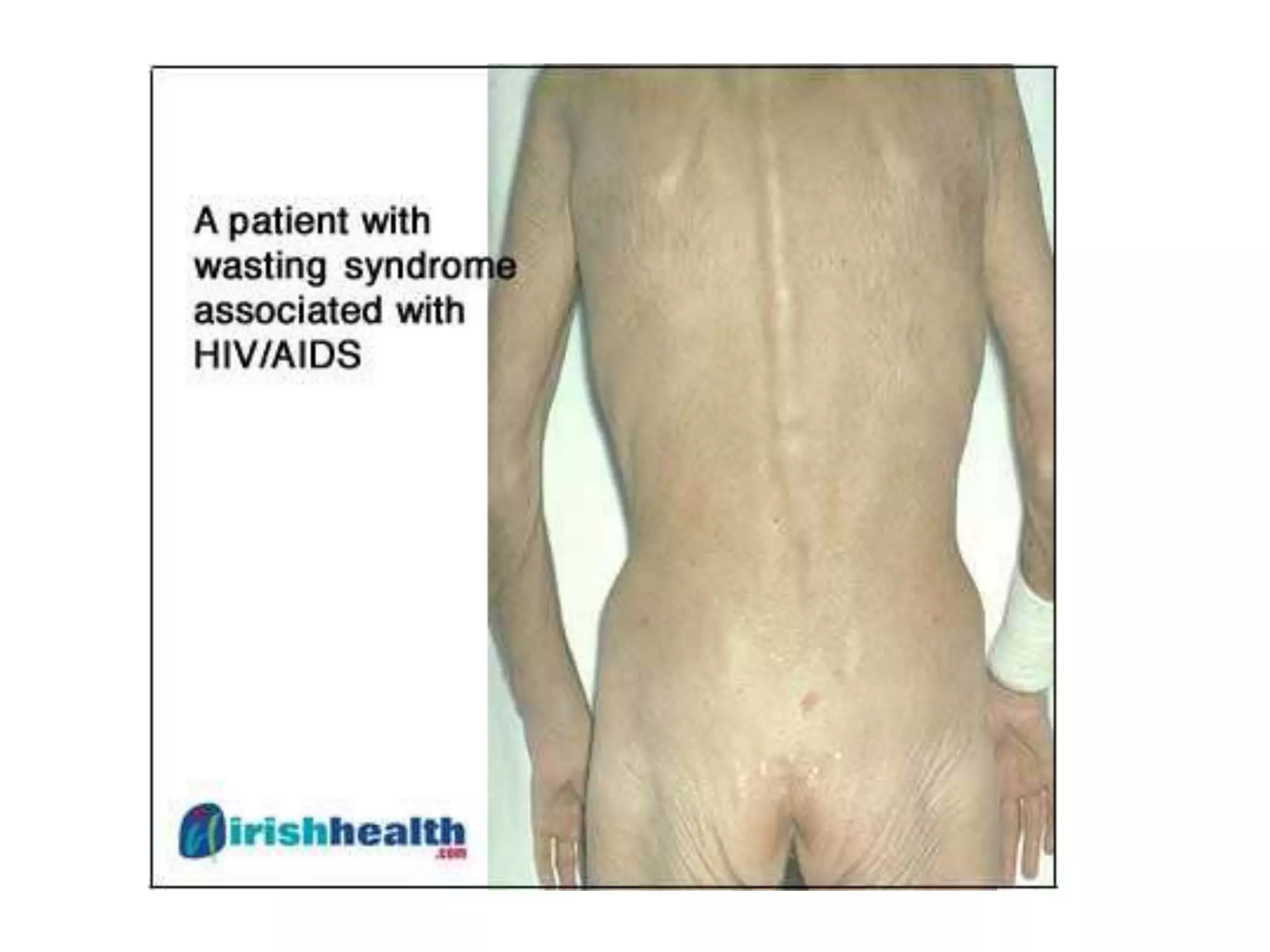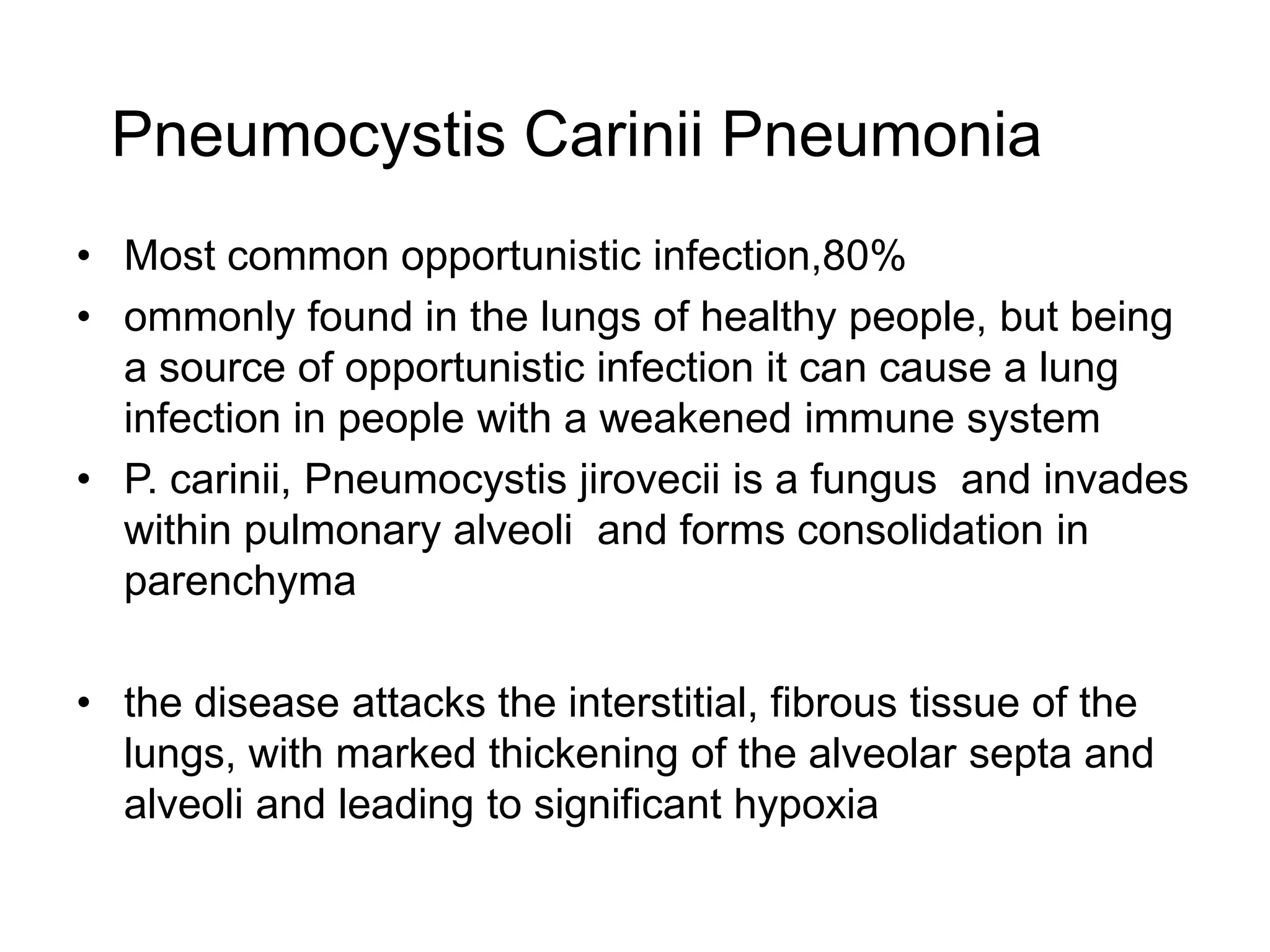 Pneumocystis carinii pneumonia is a common opportunistic lung infection caused by a fungus that takes advantage of weakened immune systems. Symptoms include nonproductive cough, fever, shortness of breath, and weight loss. Treatment involves trimethoprim-sulfamethoxazole and steroids. Mycobacterium avium complex is another opportunistic pathogen causing respiratory infections in immunocompromised individuals. Wasting syndrome is defined by over 10% involuntary weight loss and chronic diarrhea for more than 30 days. Kaposi's sarcoma is an HIV-related cancer affecting blood and lymph vessels. Cryptococcal meningitis presents with fever, headache, and neck stiffness. Highly active antiretro