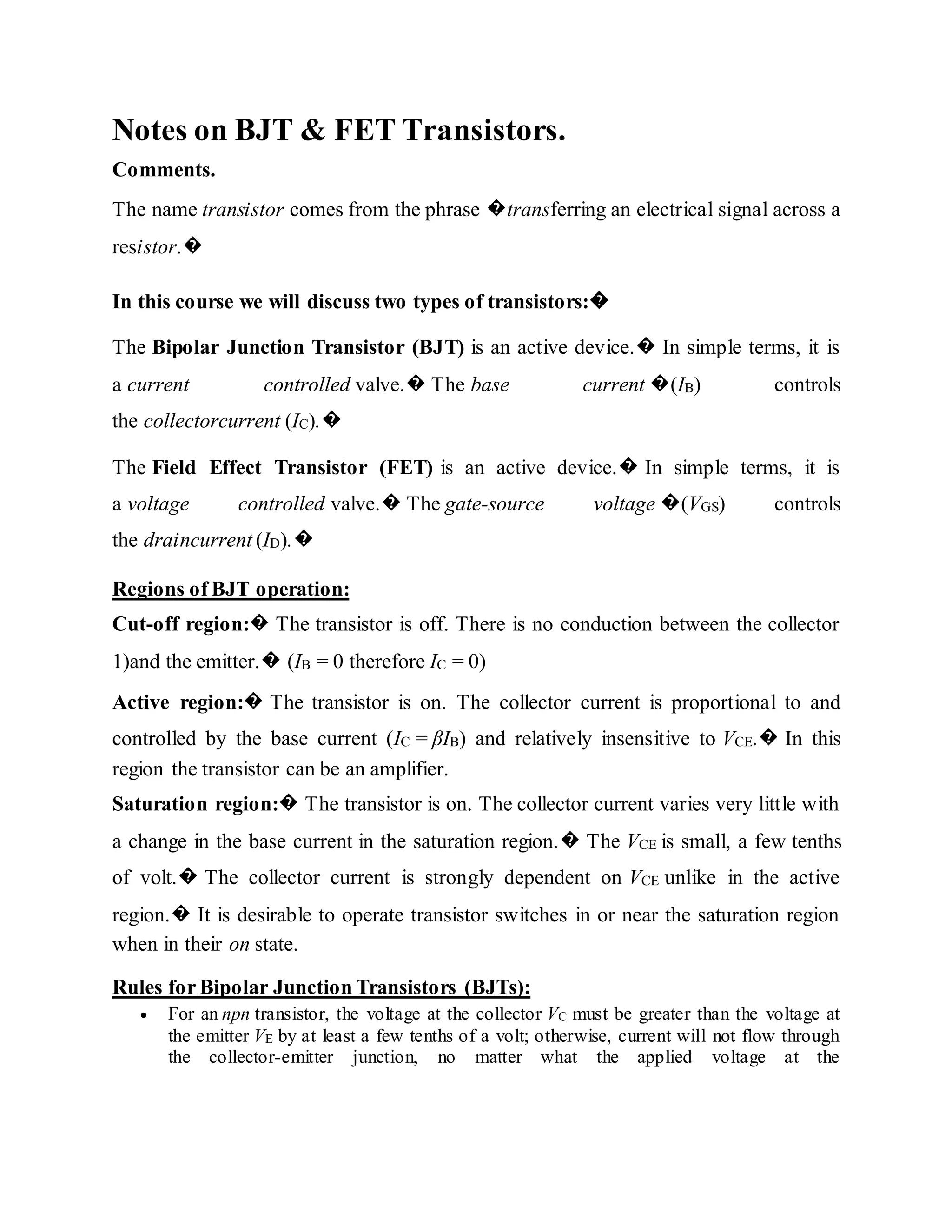 The document provides information on BJT and FET transistors. It discusses that BJTs are current controlled devices where the base current controls the collector current, while FETs are voltage controlled devices where the gate-source voltage controls the drain current. It also summarizes the different regions of operation for BJTs and JFETs, including cut-off, active, and saturation regions. Common applications of BJTs and JFETs are also covered such as voltage controlled switches and current sources.