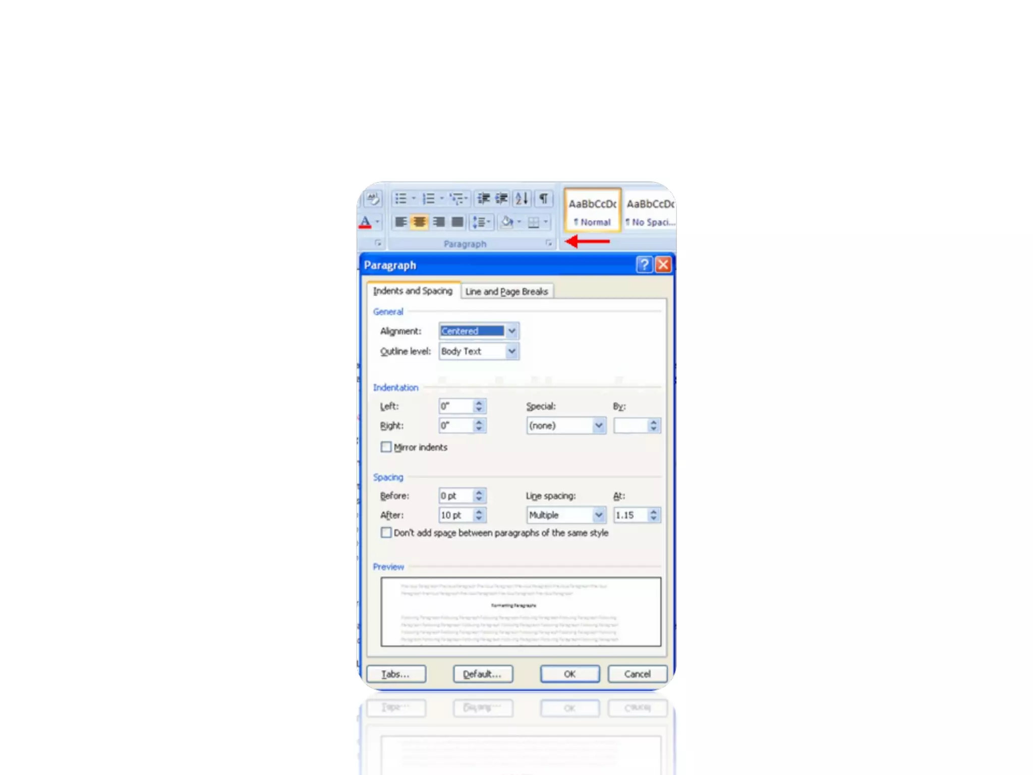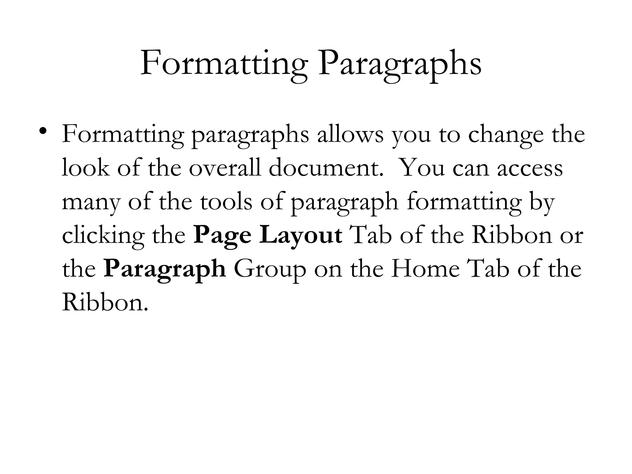 This document provides an introduction to formatting paragraphs in Microsoft Word 2007. It discusses how to change paragraph alignment, indentation, borders and shading, apply styles, create links, and adjust line and paragraph spacing. Formatting tools can be accessed on the Page Layout and Home tabs of the ribbon. Paragraph alignment is set using buttons to align text left, center, right, or justify. Indents are used to control text margins and can be set for the first line, hanging lines, left, or right. Borders and shading are added by selecting text and choosing options. Styles allow applying predefined formatting, and hyperlinks can be inserted to link text to web pages by specifying display text and a web address.