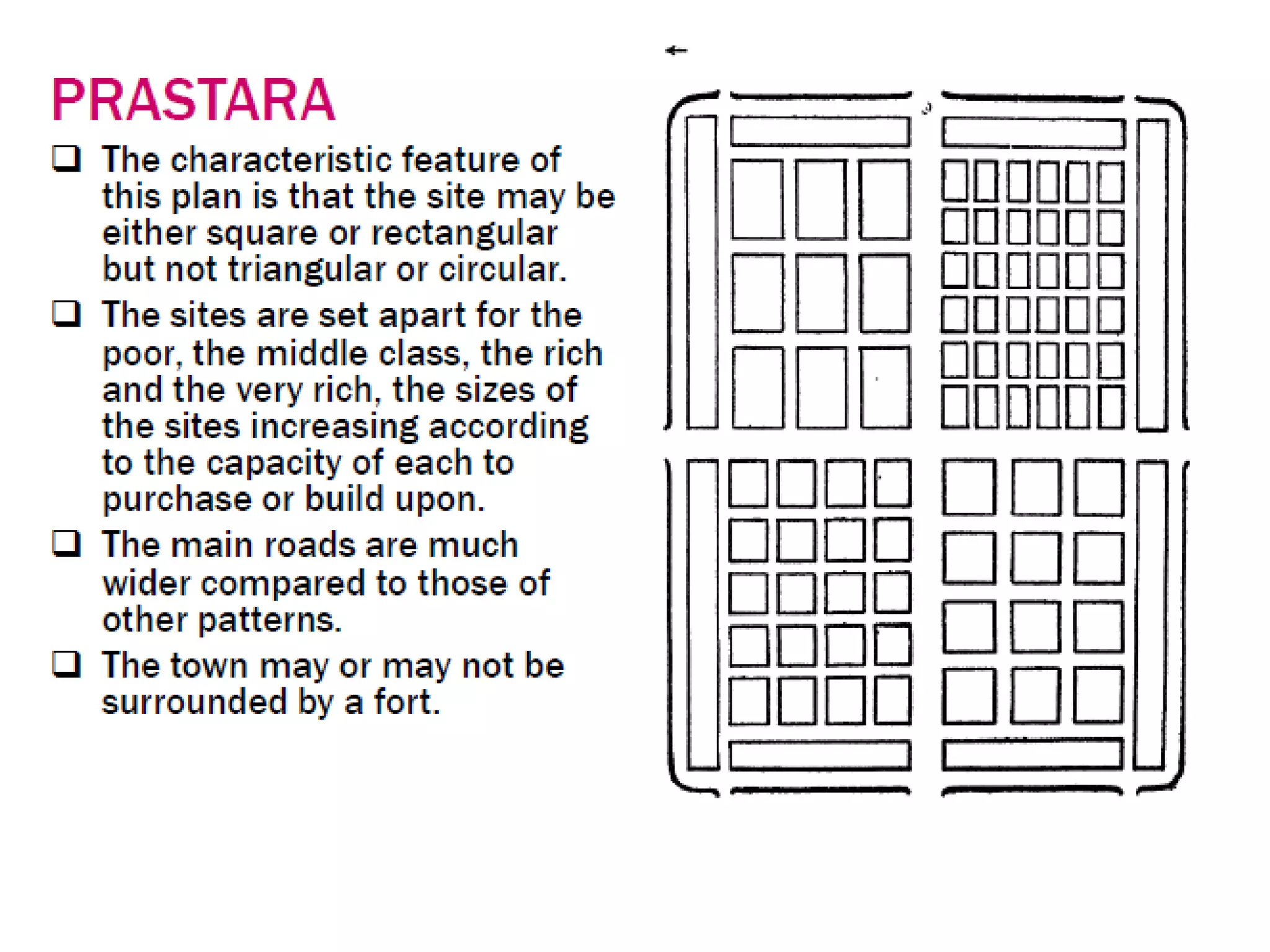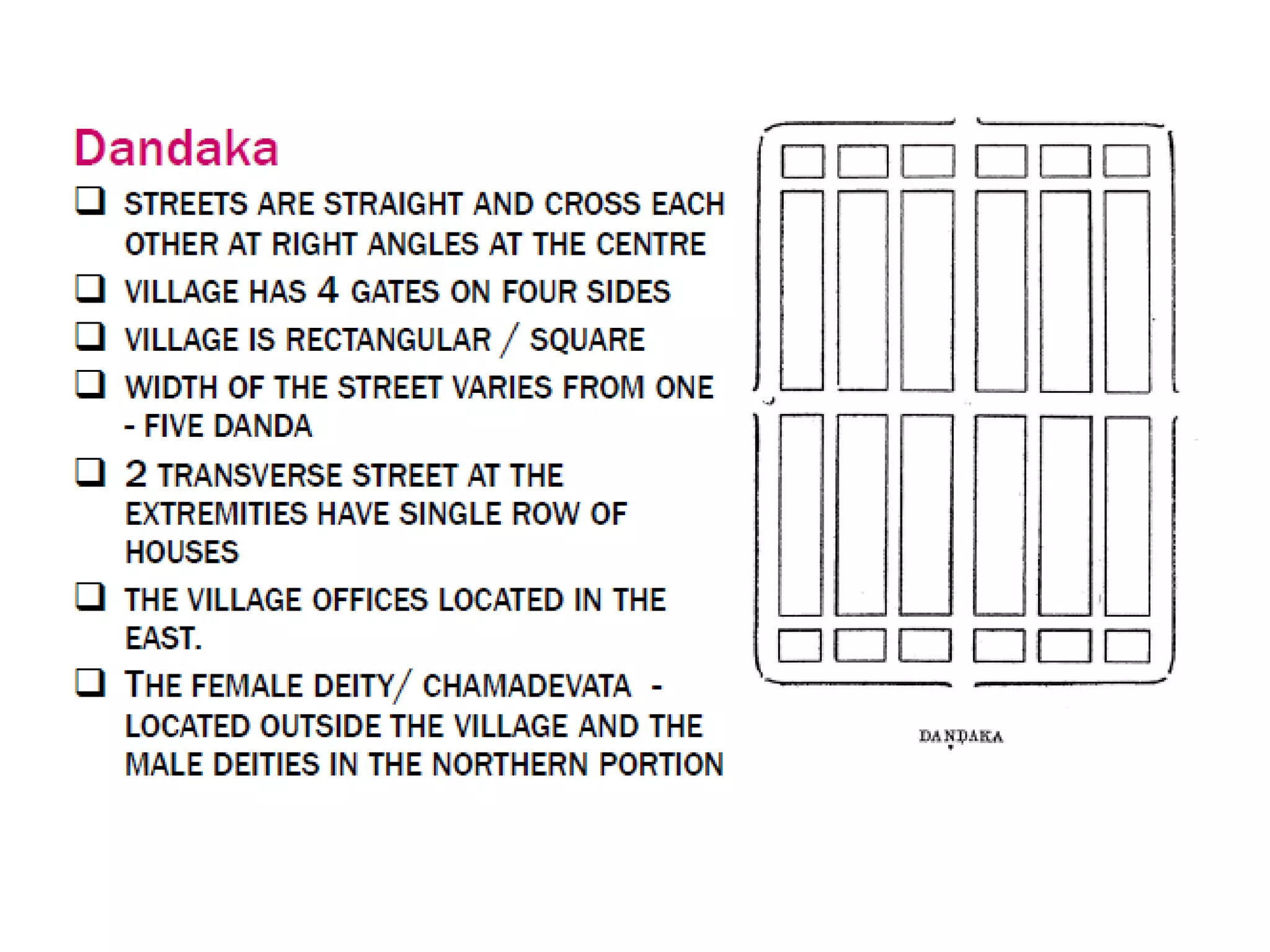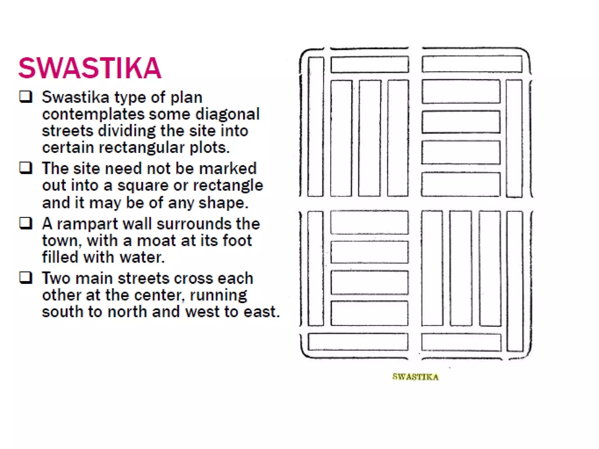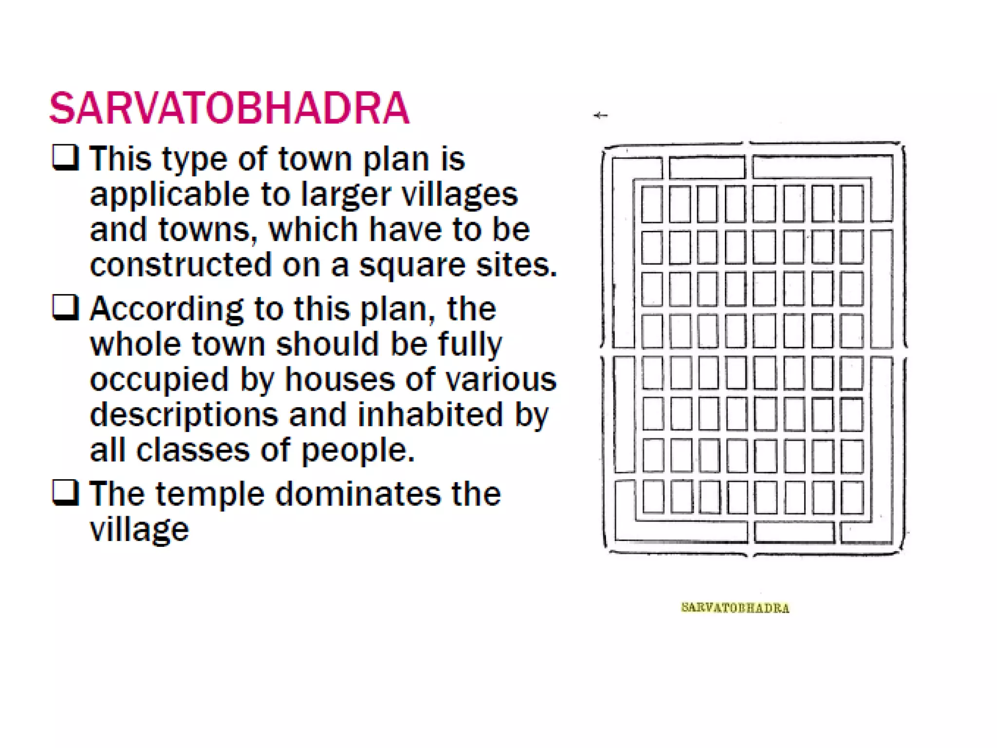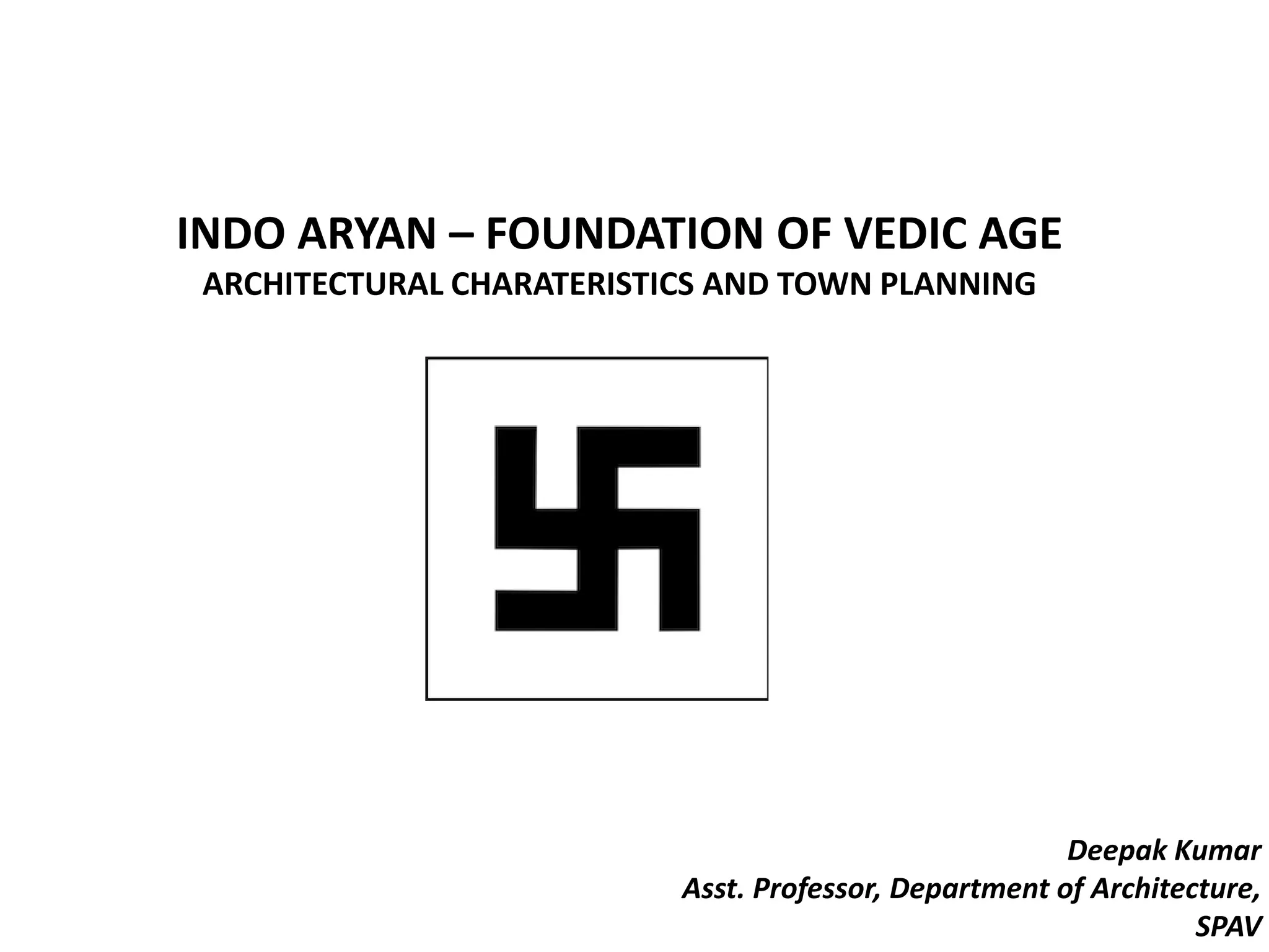 The document discusses the architectural characteristics and town planning principles of the Indo-Aryan or Vedic age in India. It describes how early towns and villages were planned according to religious texts and treatises. Circular plans made of timber and thatch later evolved into planned settlements with streets and zones for religious, residential and commercial areas. Fort design and layout of towns and villages are also discussed, outlining 12 types of forts and 20 types of towns. Principles of selecting auspicious sites based on soil quality and drainage are provided from ancient texts.