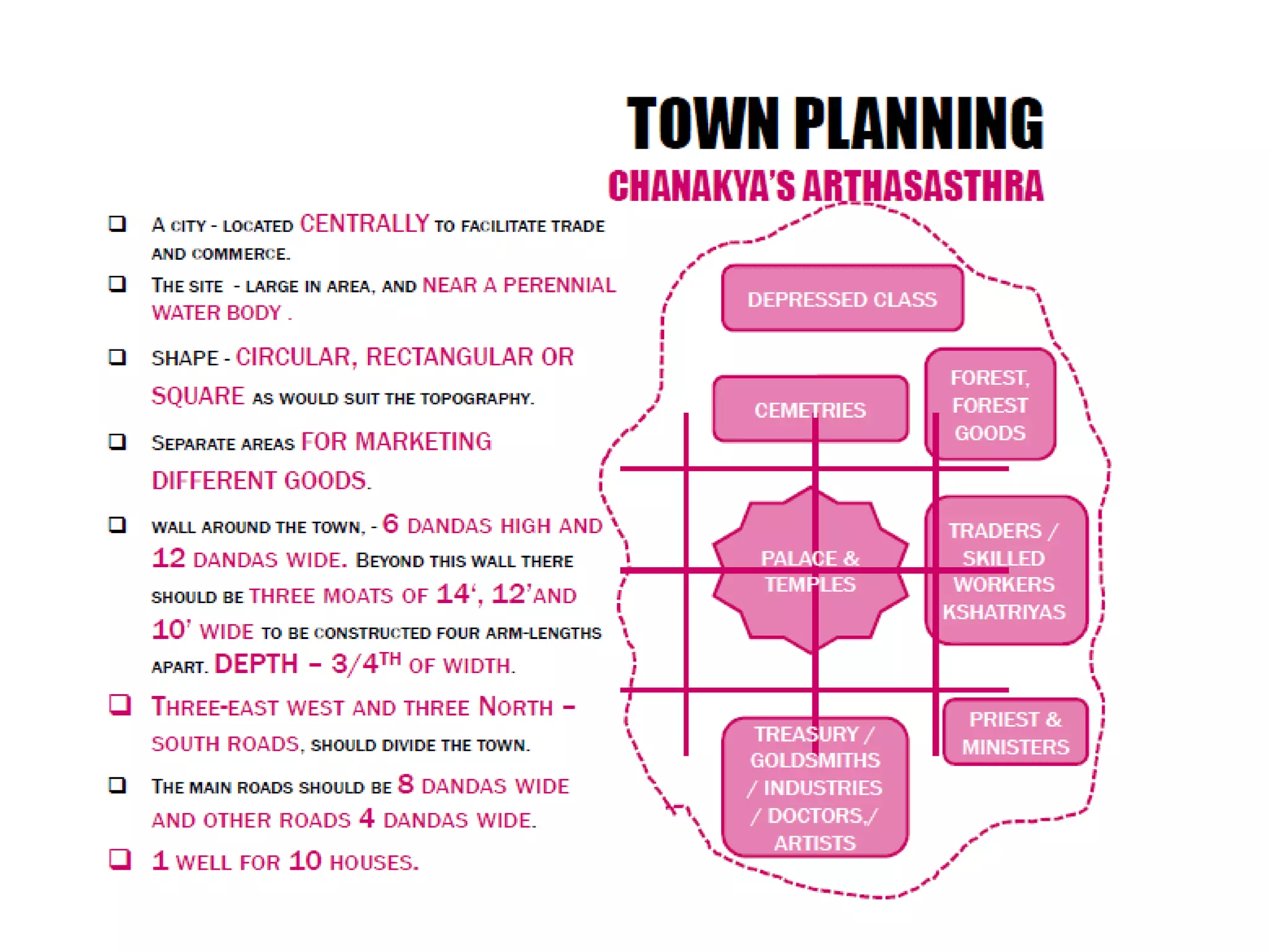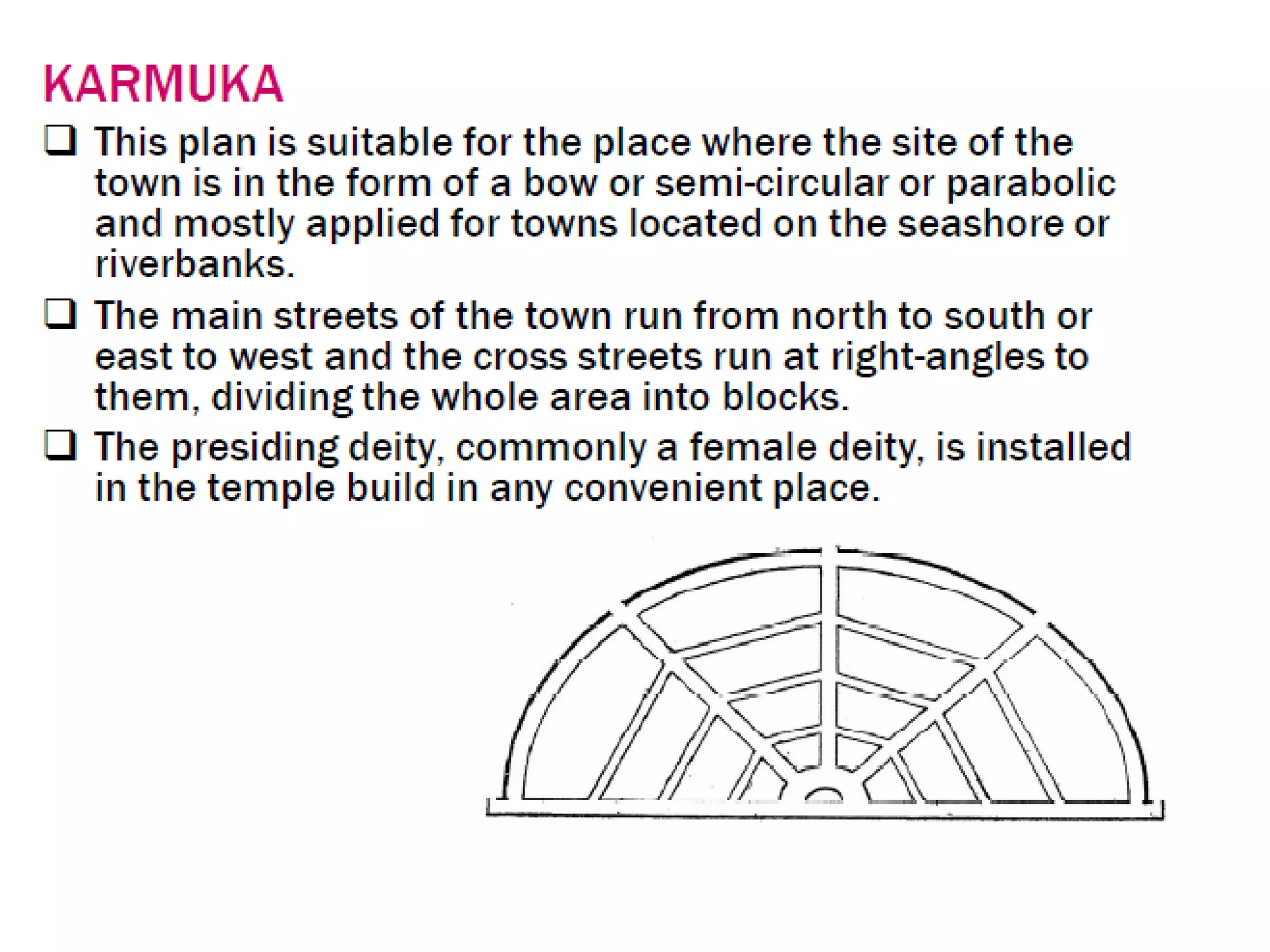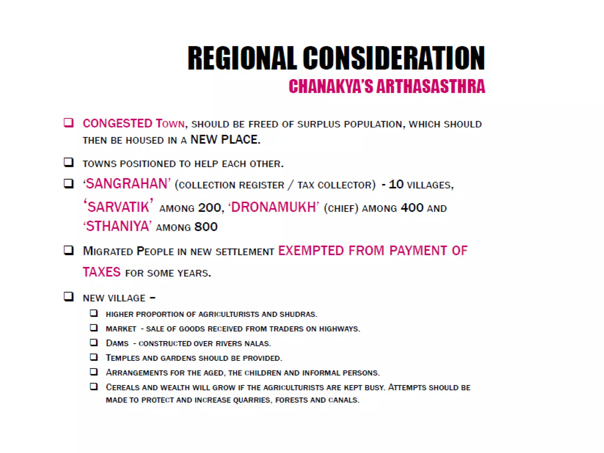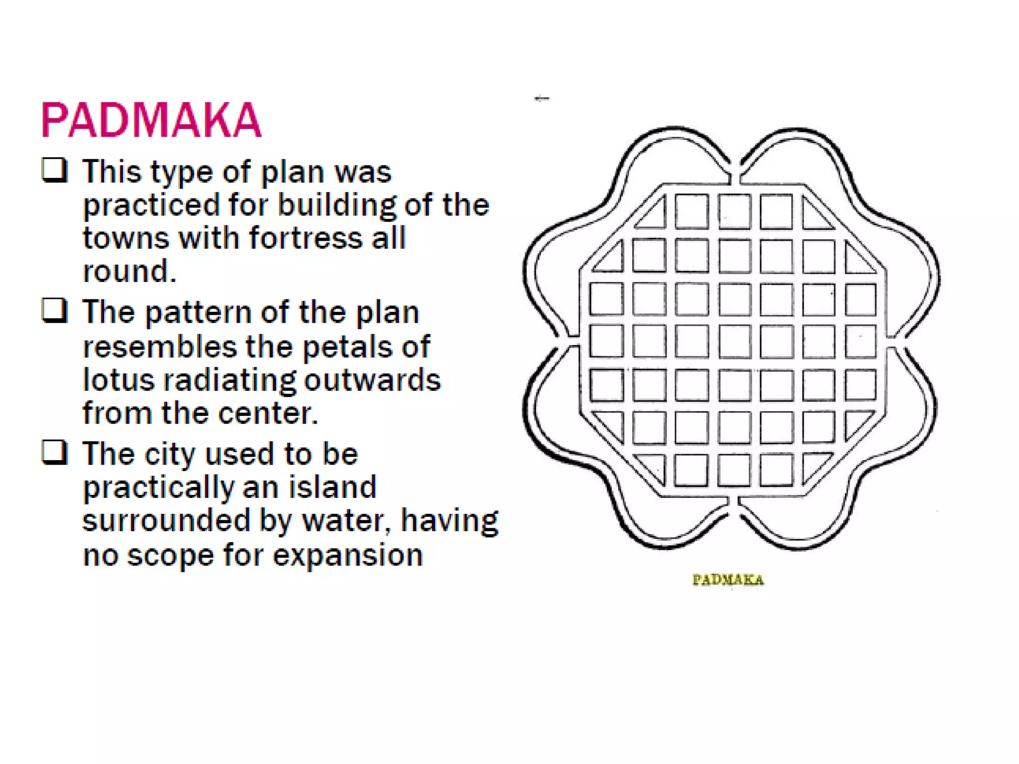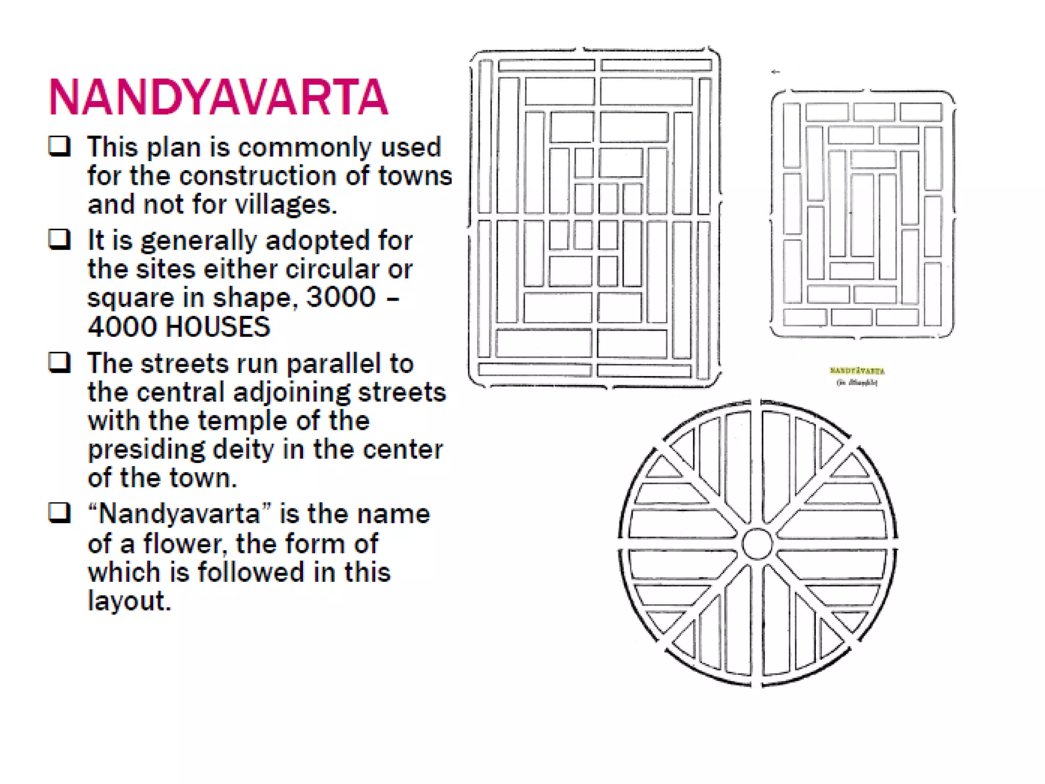 The document discusses the architectural characteristics and town planning principles of the Indo-Aryan or Vedic age in India. It describes how early towns and villages were planned according to religious texts and treatises. Circular plans made of timber and thatch later evolved into planned settlements with streets and zones for religious, residential and commercial areas. Fort design and layout of towns and villages are also discussed, outlining 12 types of forts and 20 types of towns. Principles of selecting auspicious sites based on soil quality and drainage are provided from ancient texts.