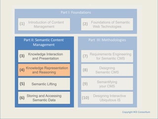 This document discusses a lecture on designing ontologies and using them to build semantic applications. The lecture will cover foundations of semantic web technologies, methodologies for semantic content management, designing semantic content management systems, and designing interactive ubiquitous information systems. It provides an outline that includes discussions on ontologies, ontology design, transformation and refactoring, and using ontology networks in content management systems platforms.