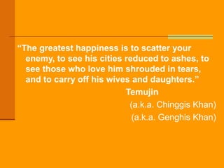 The Mongol Empire conquered a vast territory from Central Asia to Eastern Europe during the 1200s-1300s. Led by Chinggis Khan, the Mongols had a highly organized military that allowed them to defeat large empires. Though the Mongols did not make many technological or cultural contributions, their empire temporarily united much of Eurasia and facilitated an increased exchange of goods and ideas. After Chinggis Khan's death, the Mongol Empire was divided among his descendants and their khanates. The Mongols established stability and trade but are also blamed for spreading plague throughout their conquered lands.
