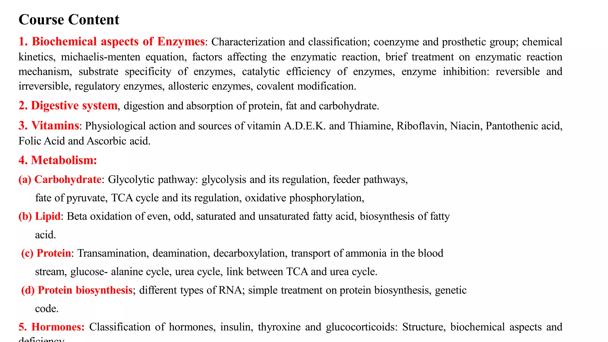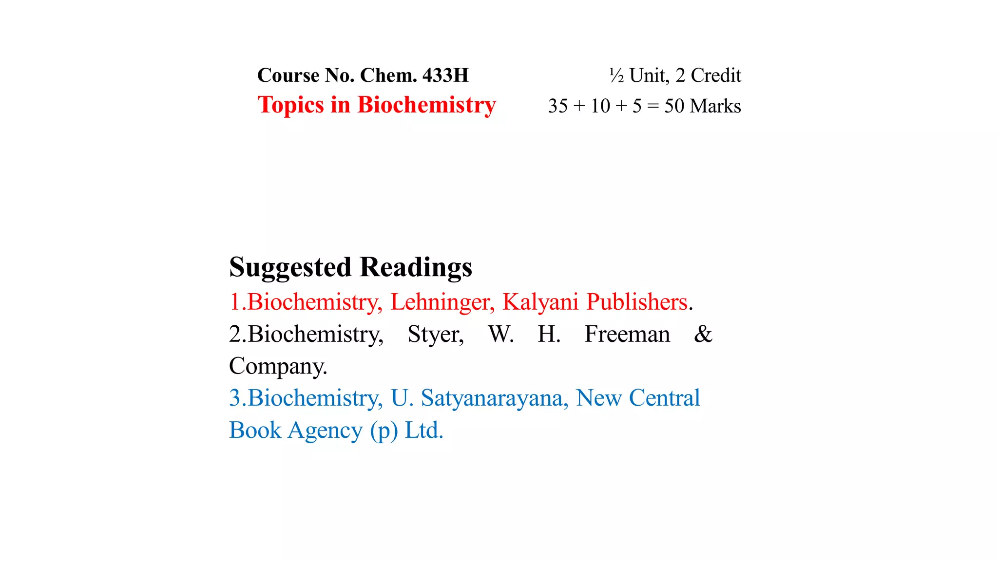 This document provides an overview of the topics that will be covered in the Biochemistry course Chem. 433H. The course will focus on biochemical aspects of enzymes, digestion, metabolism of carbohydrates, lipids and proteins, vitamins, and hormones. Specific topics that will be covered include enzymatic kinetics and regulation, digestive processes, glycolysis and the TCA cycle, beta oxidation of fatty acids, amino acid metabolism and the urea cycle, and the structure and function of insulin, thyroxine, and glucocorticoids. Readings from three biochemistry textbooks are suggested.