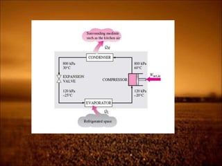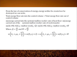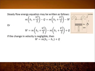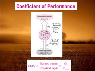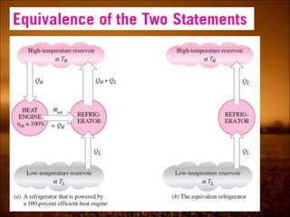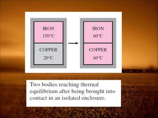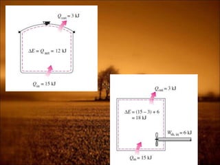 2. First law states that energy is conserved and can change forms but not be created or destroyed. It defines heat, work, and internal energy. Heat engines and refrigerators are discussed.