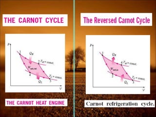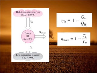 3. Second law introduces the concept of entropy and establishes limits on heat engine efficiency below 100% and prohibits converting heat to work without temperature difference. Carnot cycle and Carnot efficiency are introduced.