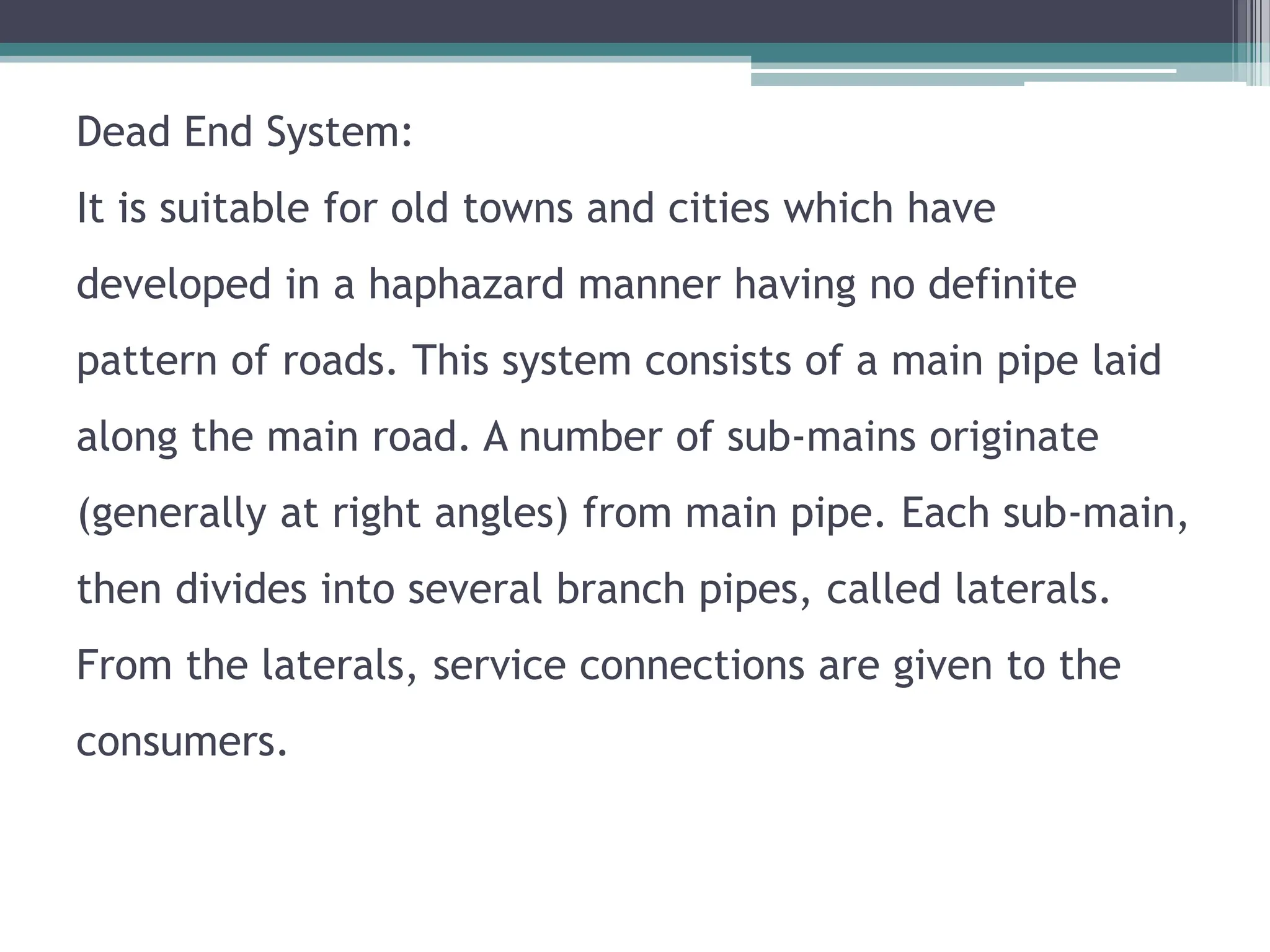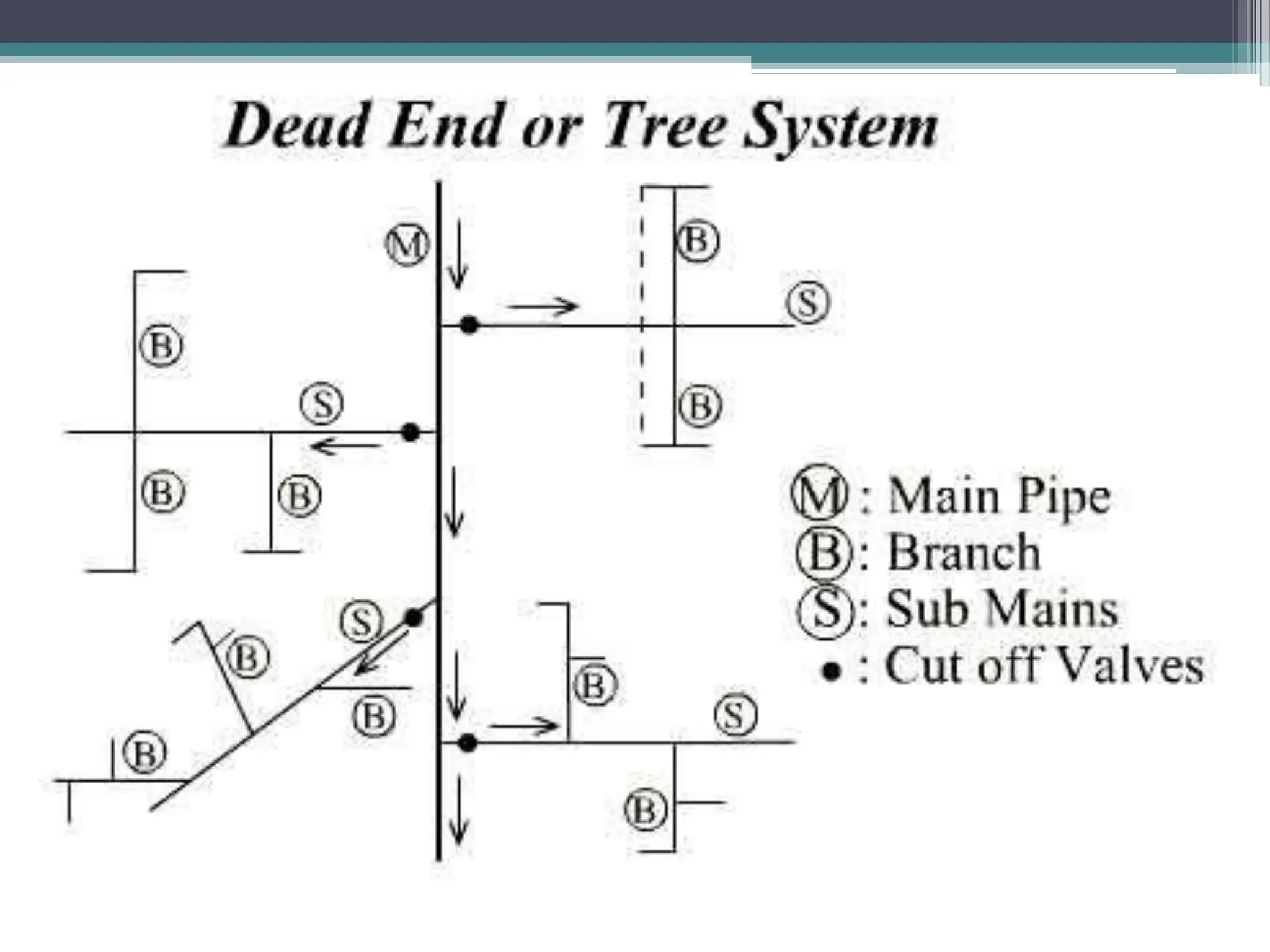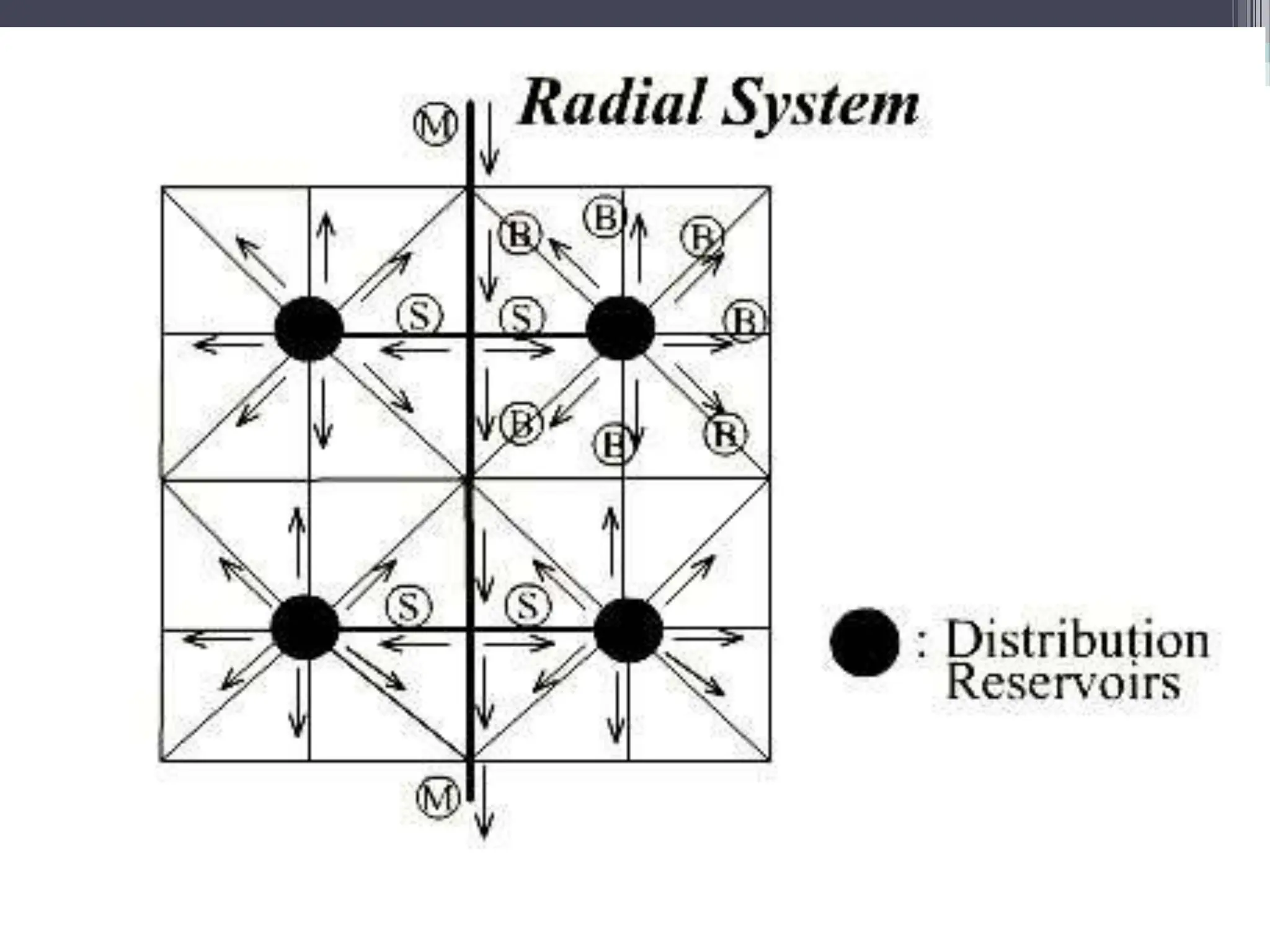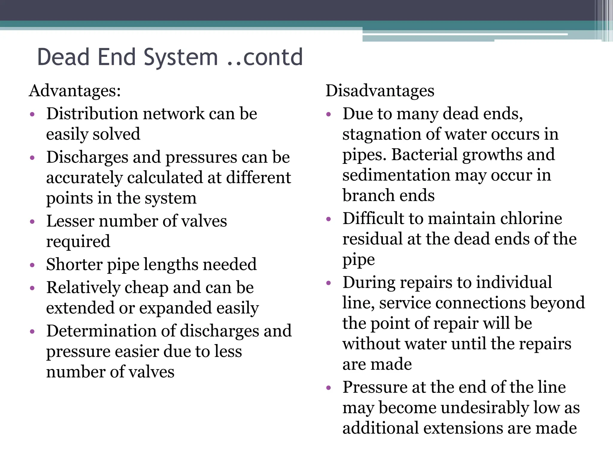 The document discusses various water distribution systems, including the dead end system, grid iron system, radial system, and ring system, highlighting their advantages and disadvantages. The dead end system is simple and cost-effective but suffers from stagnation and maintenance issues, while the grid iron system ensures better water circulation but requires more infrastructure. The radial and ring systems provide quick service and flexible water supply, respectively, with their own unique benefits and challenges.