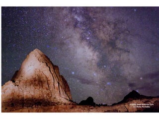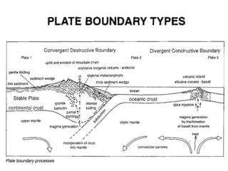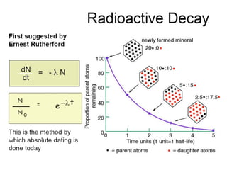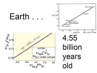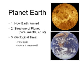 The document provides an overview of the formation and composition of the solar system, detailing the characteristics of the inner terrestrial planets and outer jovian planets. It highlights Earth's unique attributes, including its status as the only known planet to support life, and discusses the internal structure of Earth along with evidence supporting the theory of plate tectonics and continental drift. The document also touches upon methods used by geochronologists to date the Earth and the geological time scale.