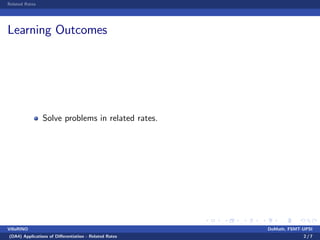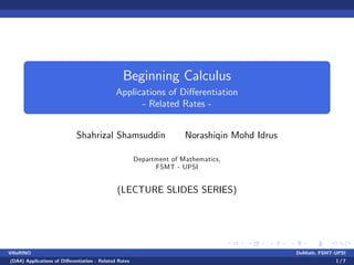This document contains lecture slides on related rates from the Department of Mathematics at FSMT - UPSI. It begins with the learning outcome of solving problems in related rates. Then, it provides two examples - one involving a police radar gun calculating a driver's speed, and another involving calculating the rate of rise of water in a conical tank being filled. Both examples demonstrate setting up and solving related rates problems using differentiation.