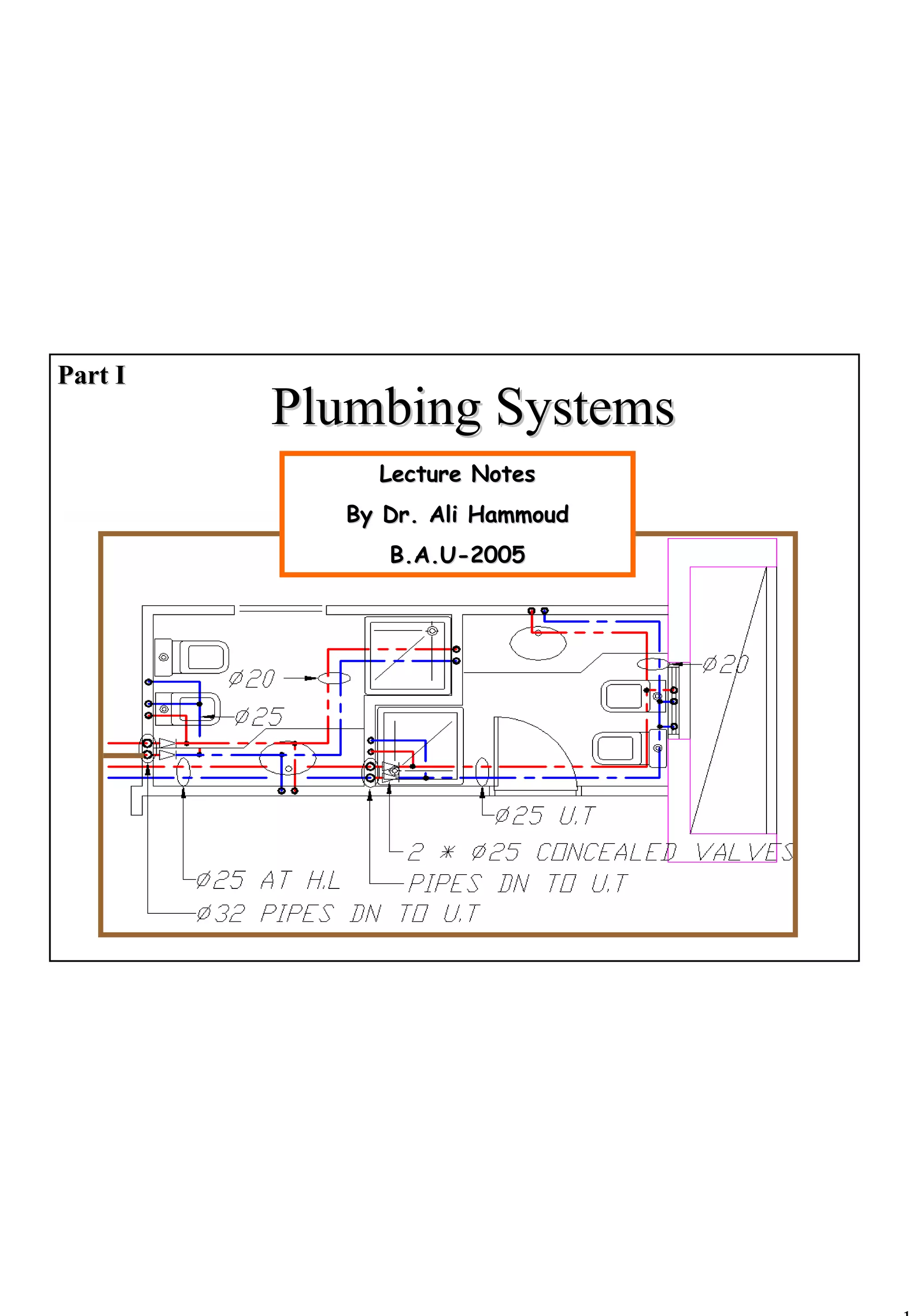 This document outlines a mechanical engineering course on plumbing systems. The course will cover the design and calculations of cold and hot water distribution systems and sanitary systems used in buildings. It will focus on a specific project consisting of two apartment blocks with 18 and 17 floors respectively. The course objectives are defined and symbols and legends for plumbing drawings are provided. Methods for reading and drawing water distribution systems are demonstrated. Sample plumbing fixture details and distribution system diagrams are shown.