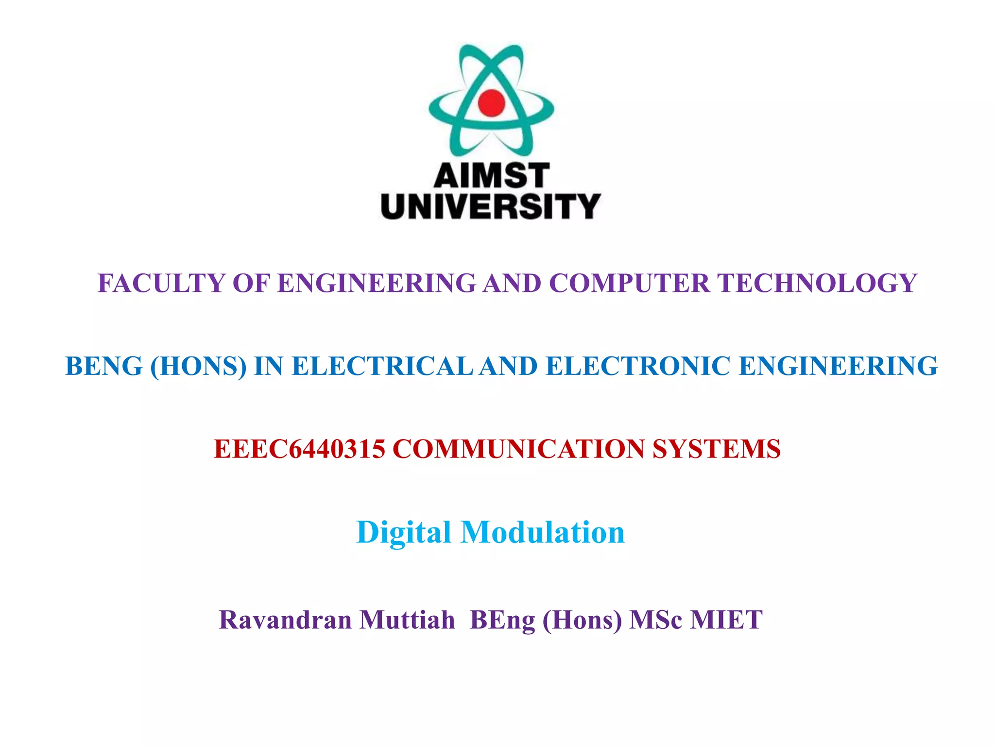 This document discusses digital modulation techniques used in digital radio systems. It begins by explaining the key difference between digital and analog modulation is that the modulating signal in digital modulation is digital rather than analog. It then provides a block diagram of a basic digital radio system including a precoder, modulator, transmission medium, and demodulator.