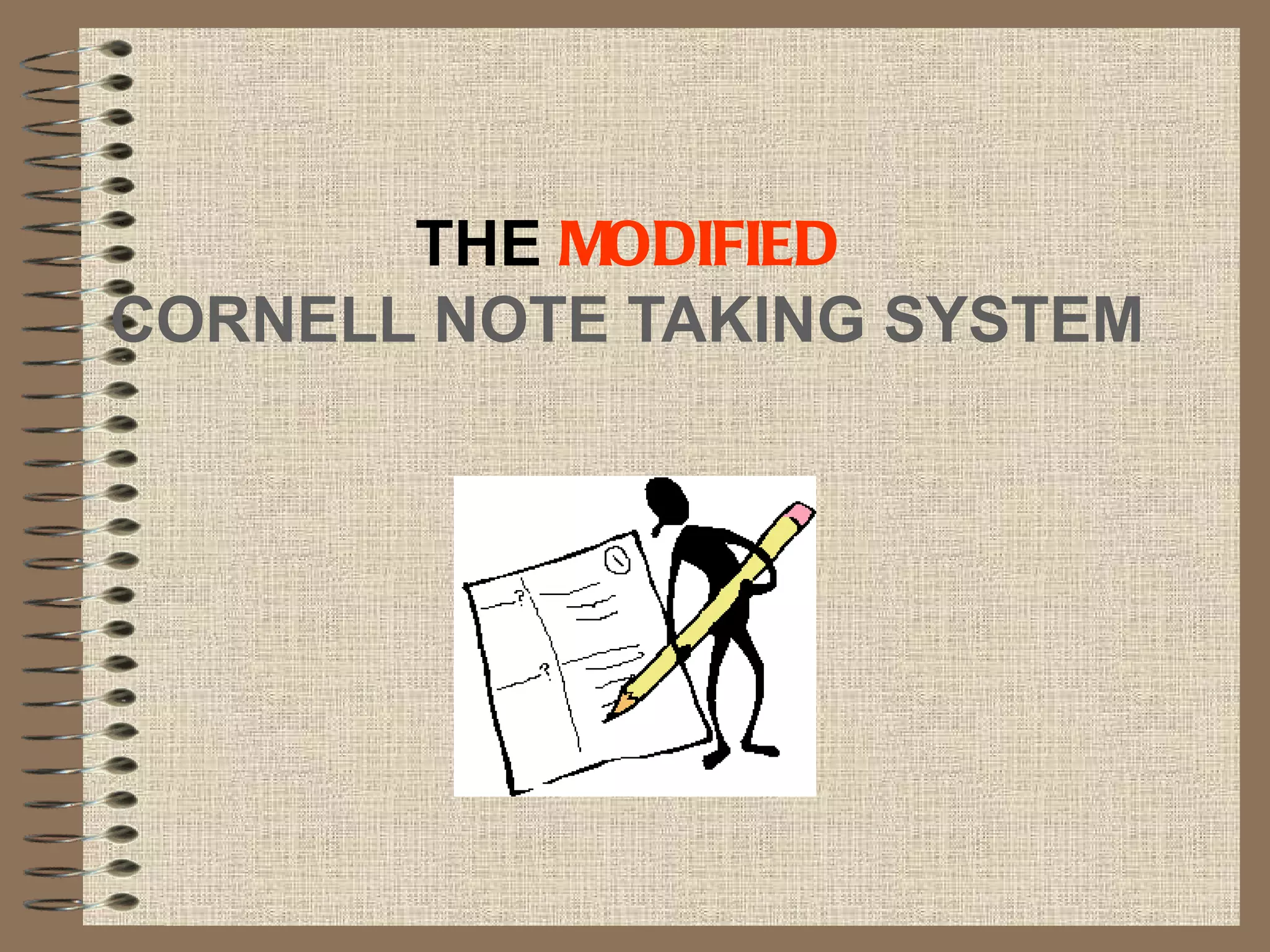 The document describes the Modified Cornell Note Taking System for organizing lecture notes. It consists of a record column on the right for writing main ideas and details, and a question column on the left for writing questions about the notes. After class, questions are written in the question column corresponding to the notes. Later, the questions can be answered without looking at the notes to help with memory retention. The system promotes relating ideas, leaving space for additions, and reviewing notes weekly.