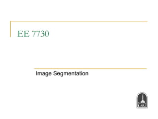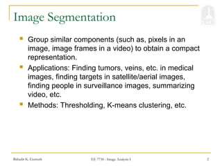 The document discusses image segmentation techniques, which are essential for grouping similar components in images, with applications in medical imaging, surveillance, and video summarization. Key methods include thresholding, region-oriented segmentation, and k-means clustering, each with its specific approaches for handling grayscale and color images. Additionally, the watershed algorithm is described for finding regional minima, while k-means clustering is used to partition data points into clusters based on distance metrics.
