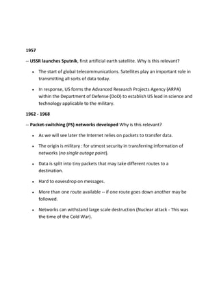 The document provides a detailed history and timeline of the development of the Internet from 1836 to 1997. Some of the key events and developments include: