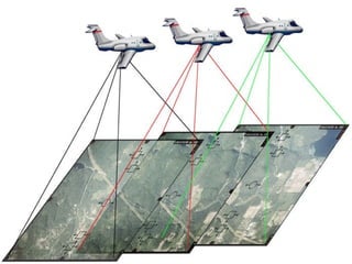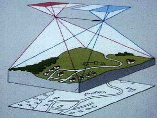 Photogrammetry is the science of obtaining reliable measurements from photographs. There are three main techniques: aerial, using vertically downward photos from planes or satellites; terrestrial, using horizontal photos on the ground; and industrial, adapting terrestrial techniques to small areas. Aerial photos are used for topographic mapping, cadastral plans, land use maps, and hydrographic charts. Stereo plotters allow precise 3D measurement and analysis from stereo photo pairs. Photogrammetry has many applications beyond traditional surveying, including traffic accident reconstruction, medical imaging, and analysis of surface movement.