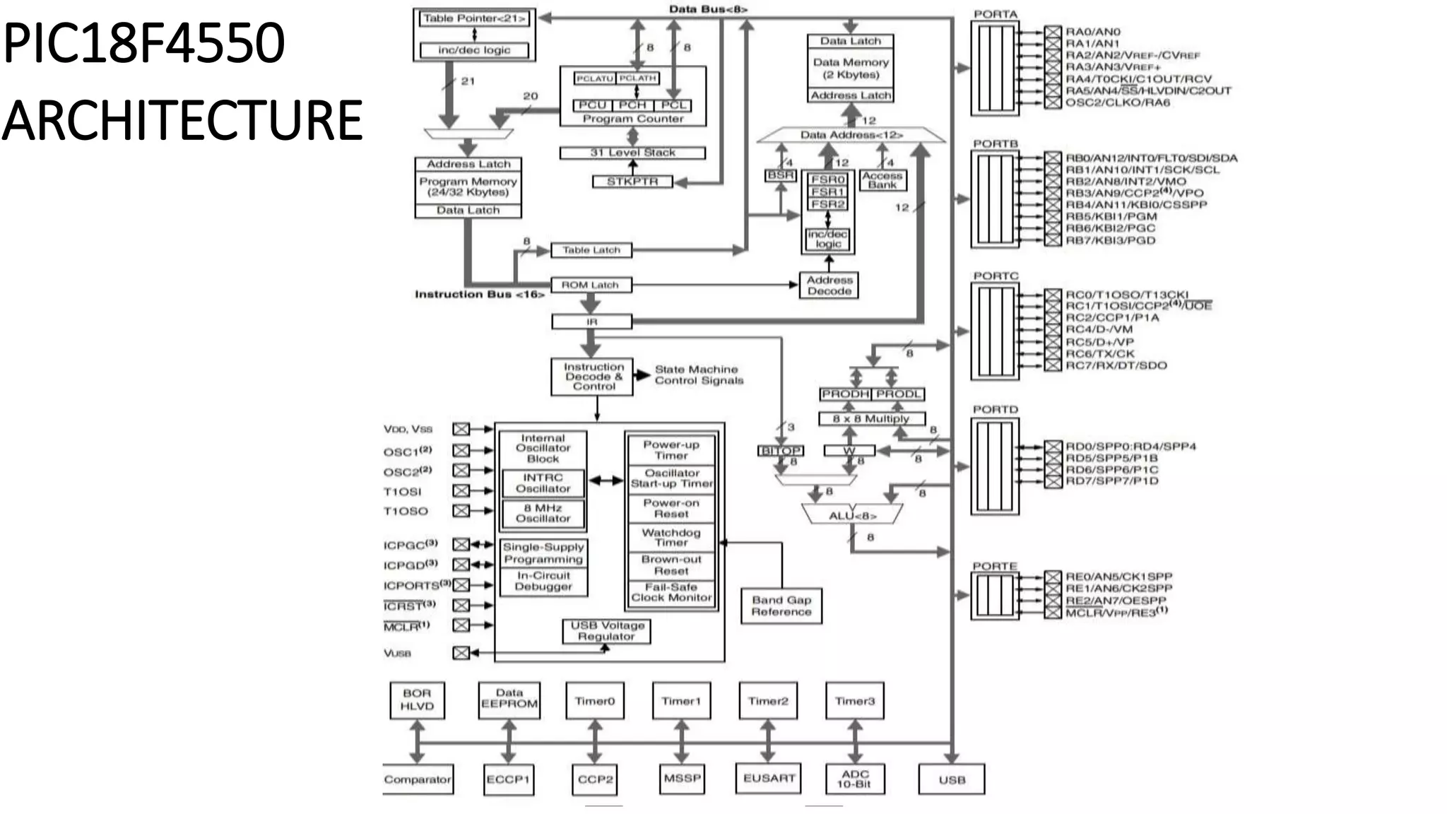 The document discusses the architecture and components of PIC18 microcontrollers. It describes the arithmetic logic unit (ALU) and its associated registers. It explains machine cycles, instruction execution, and pipelining. It also covers oscillators, configuration bits, reset options, low power modes, watchdog timers, and the program counter. It compares Harvard and von Neumann architectures.