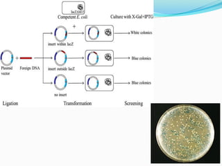 pUC plasmids are small, high copy number cloning vectors developed at the University of California. They contain an ampicillin resistance gene and a multiple cloning site inserted into the lacZ gene. Inserting foreign DNA into the multiple cloning site interrupts the lacZ gene, allowing clones containing inserts to be detected via blue-white screening on media containing X-gal. pUC plasmids are useful cloning vectors due to their high copy number, antibiotic resistance marker, and ability to easily identify recombinant clones.